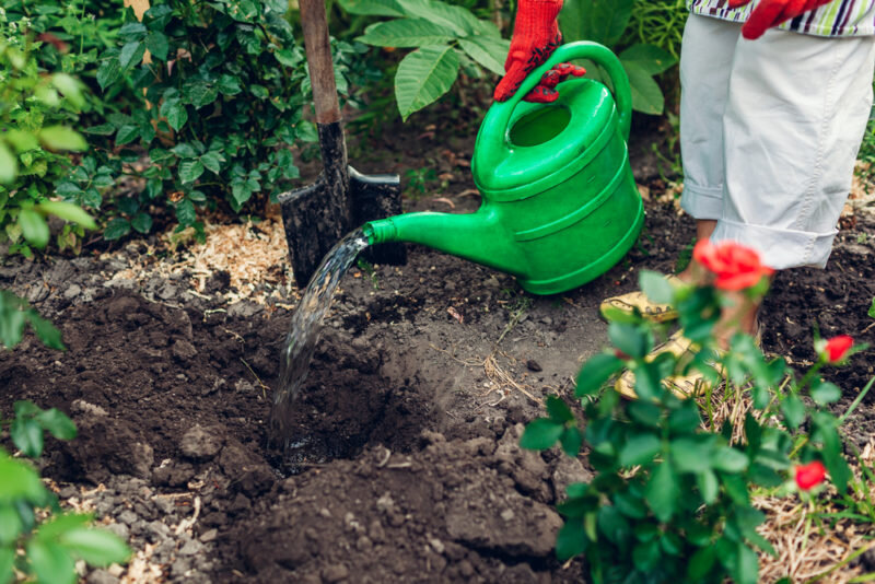 При посадке готовьте широкую (40 см) и глубокую (60 см) ямку с дренажом. Опускайте стебель в лунку, расправляя корни, а затем аккуратно засыпайте землей с добавлением золы и поливайте саженец, чтобы обеспечить ему комфортные условия для жизни.