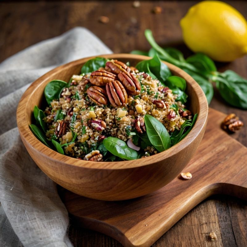 - Ингредиенты: Киноа, орехи пекан, семена чиа, лимонный сок, оливковое масло, шпинат, соль и перец.