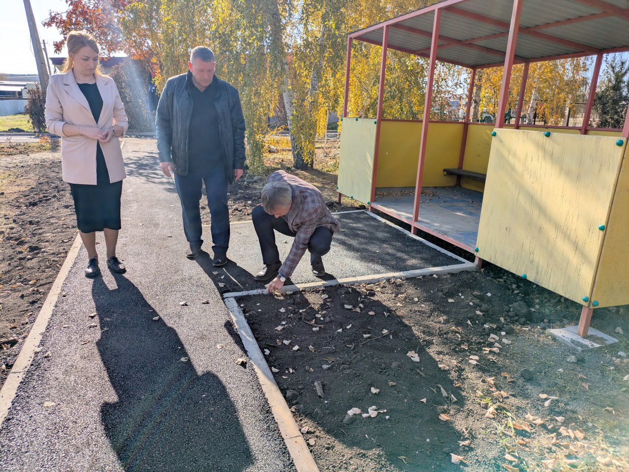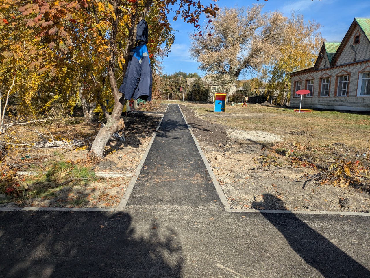 Во дворе детсада ремонт только закончен. Я ходил по еще мягкому неокрепшему асфальту. Асфальтирована дорога, тротуары к беседкам, отмостка здания. Асфальт применен хорошей марки, уложен без нареканий. А вот, когда катком закатывали асфальт на узких дорожках, машина в некоторых местах обломала края тротуарного бордюрного камня. Я сказал заведующей детсада и присутствующему прорабу, чтобы заменили дефектные камни. Обещали заменить.