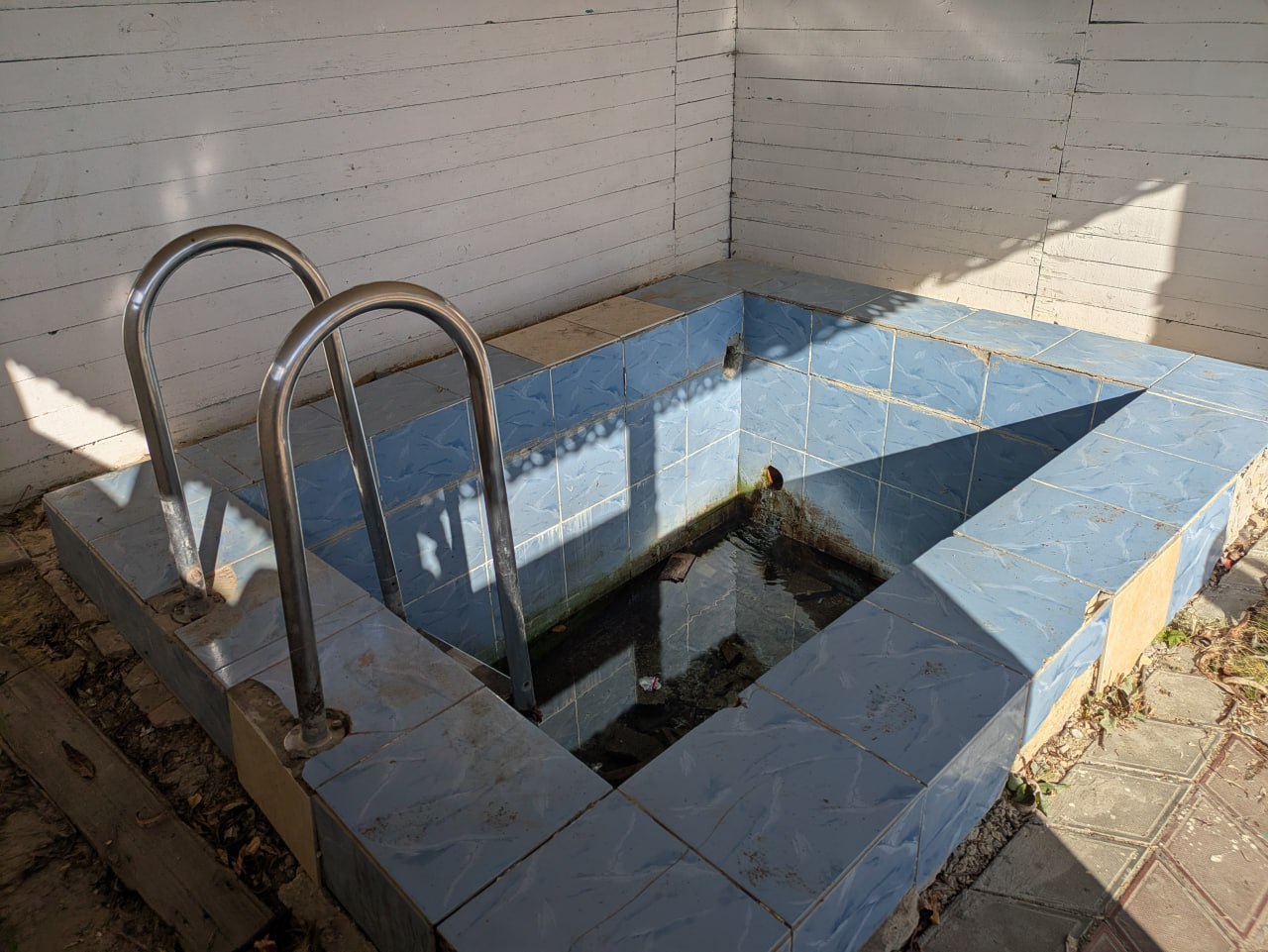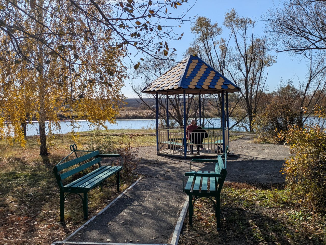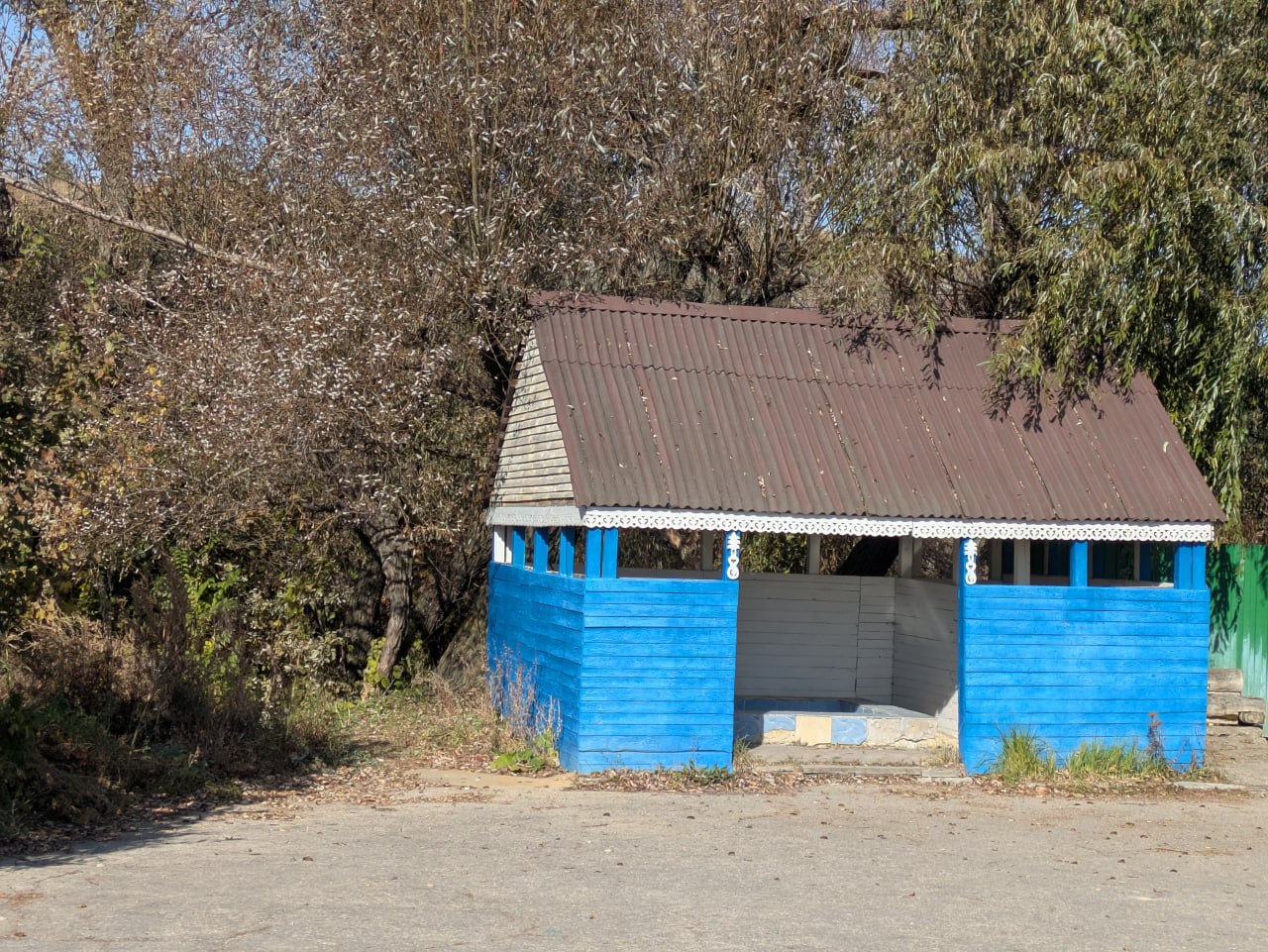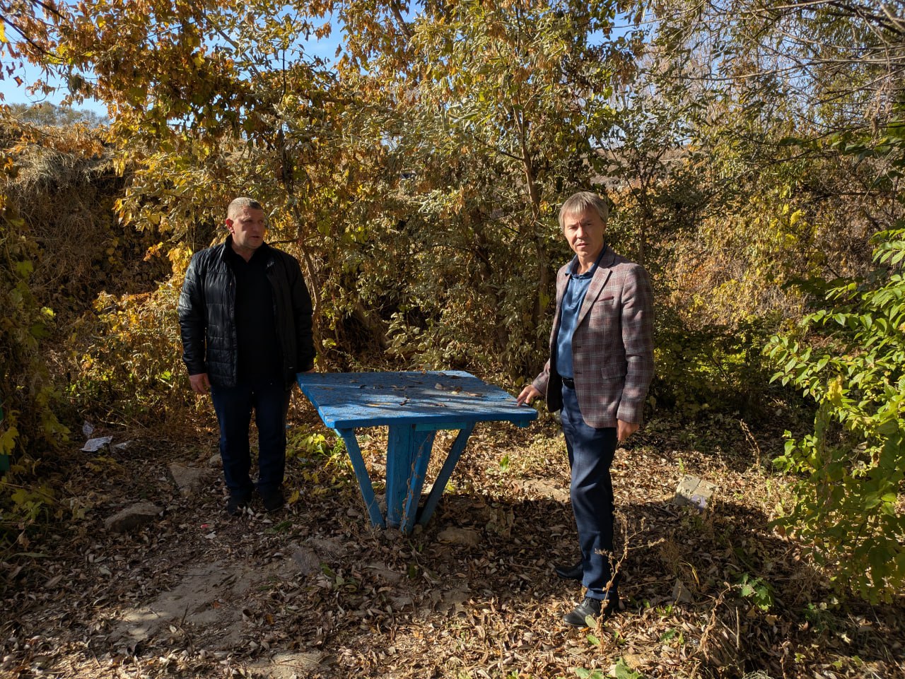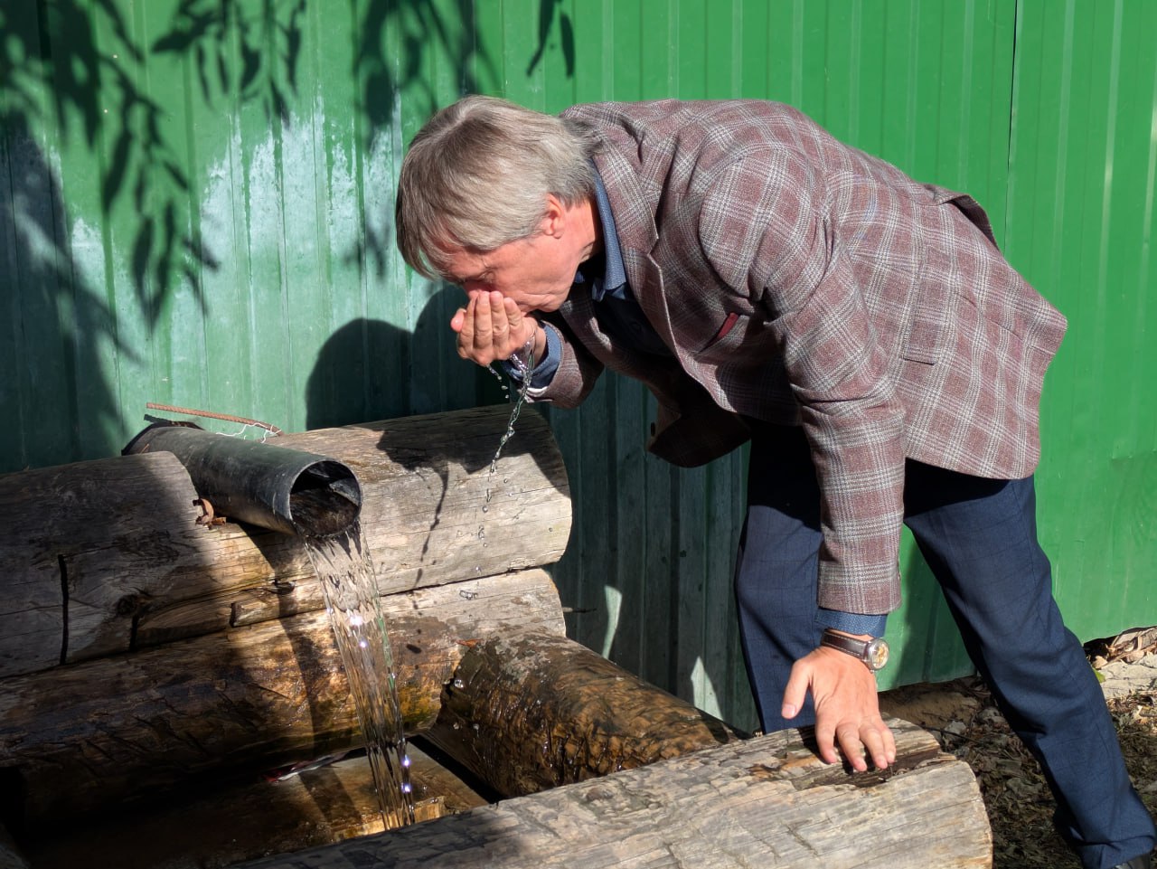 Сергей Поликарпов сводил меня на родник Центральный, который бьет в черте села. Там есть крытая крещенская купель, куда поступает вода. Она находится в плохом состоянии. А вот беседка, которая была на берегу речки, берущей начало от родника, вообще разрушилась, и от нее остался лишь разваливающийся столик. Глава МО просил помочь в восстановлении беседки. Он хочет сделать ее железной, как на пруду у дома-интерната (см. фото). Я обещал рассмотреть эту просьбу в следующем году.