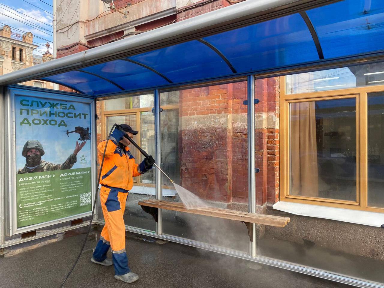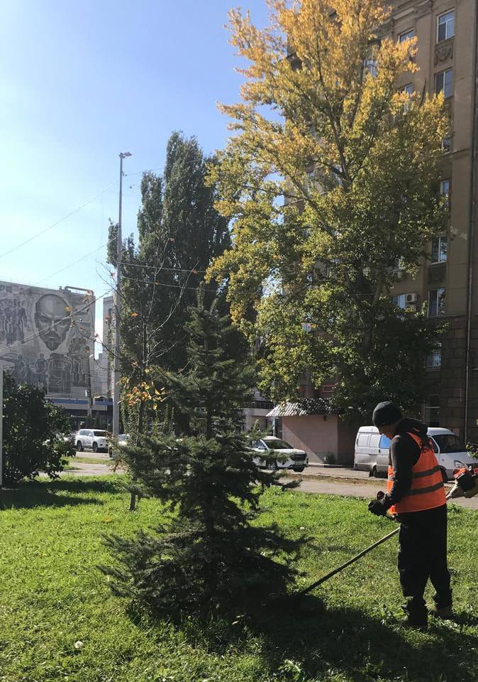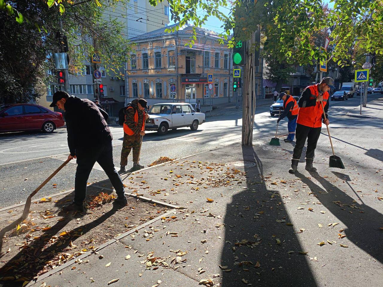 Коммунальные службы выполняют уборку дорожного полотна и пешеходных зон, мойку остановочных павильонов, подготовку цветников к зимнему периоду, обрезку кустарников и деревьев, сбор случайного мусора, опавшей листвы и другие работы