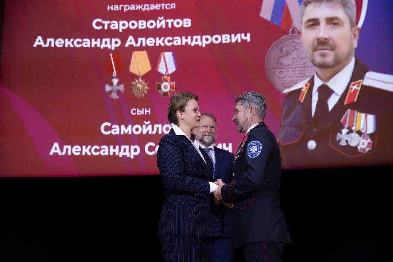 Как показал опыт нашей страны, деды и отцы воспитали поколение патриотов, достойное уважения и почитания. С гордостью вручила медаль «За воспитание защитника и личный пример» Александру Старовойтову из Краснодарского края. В 2014 году он встал на защиту Донбасса, был тяжело ранен, а в 2023-м возглавил региональный филиал фонда «Защитники Отечества». Сын пошел по стопам отца: был волонтером, а затем вступил в добровольческое формирование.