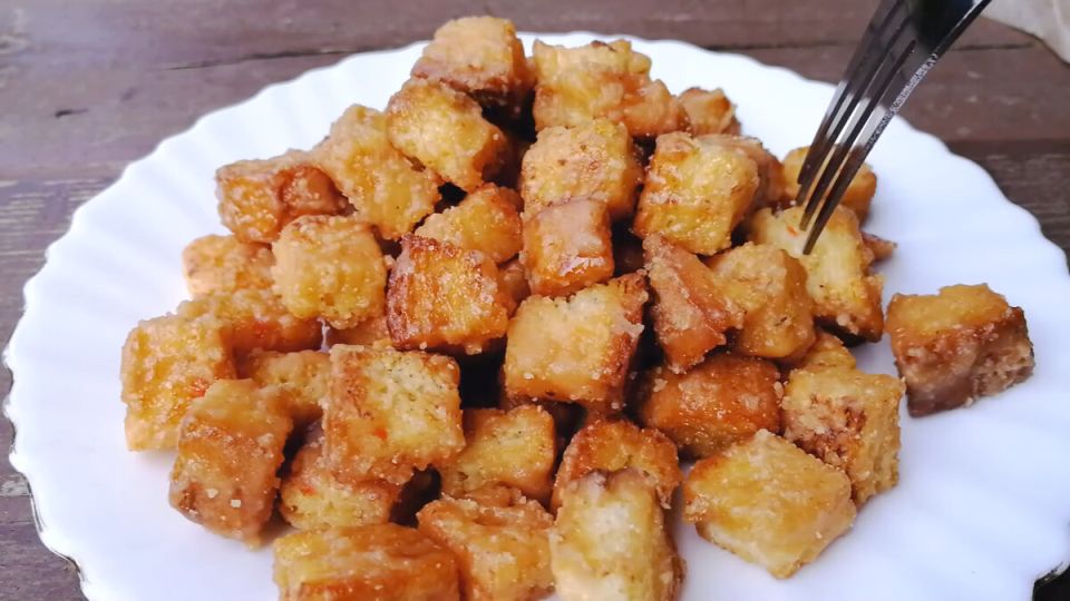 Для создания этого лакомства подходит как кукурузный, так и любой другой хлеб – белый или отрубной. Невероятный вкус кубиков зависит от того, насколько тщательно обжарен хлеб. На сковороде с небольшим количеством масла хлеб нарезают на небольшие кусочки и обжаривают до золотистой корочки. Можно сделать их более хрустящими или оставить чуть мягче в зависимости от предпочтений.