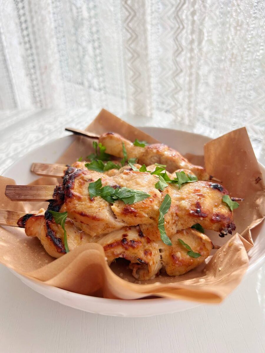 Как только курица промаринуется, насаживайте кусочки на шпажки. Обязательно покройте их получившимся соусом и отправьте в духовку, предварительно разогретую до 175 градусов. Запекайте около 25 минут, следите за тем, чтобы не пересушить мясо — вкус должен быть нежным и сочным!