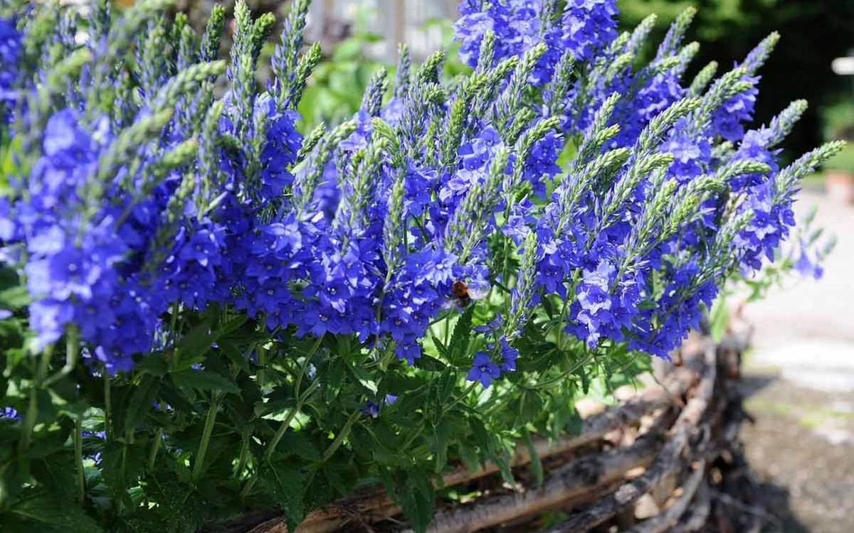 - Вероника большая: это многолетнее растение с яркими синими, розовыми и белыми цветками, достигающее 60 см.