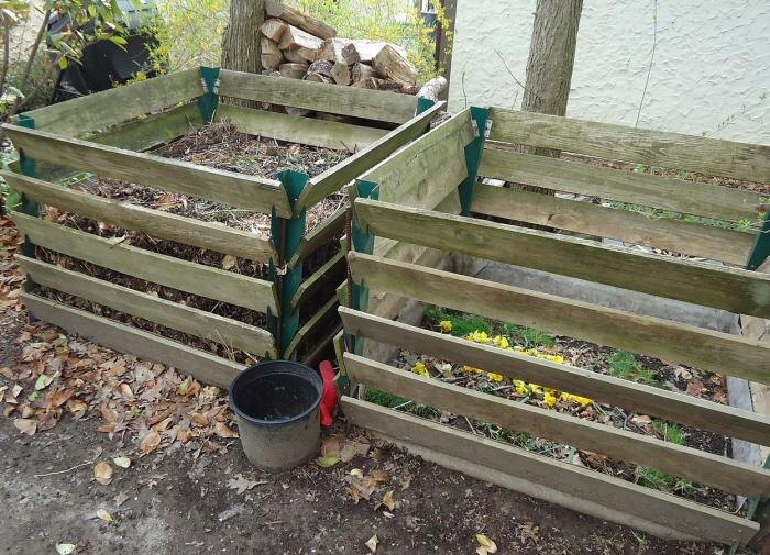 Оптимальнее всего создать компостную кучу — так обеспечивается лучшая циркуляция воздуха. Для этого используйте подручные материалы, такие как доски или металлическая сетка, оставляя зазоры для вентиляции. Идеальные размеры кучи — 1-1,5 метра в ширину и 1 метр в высоту.