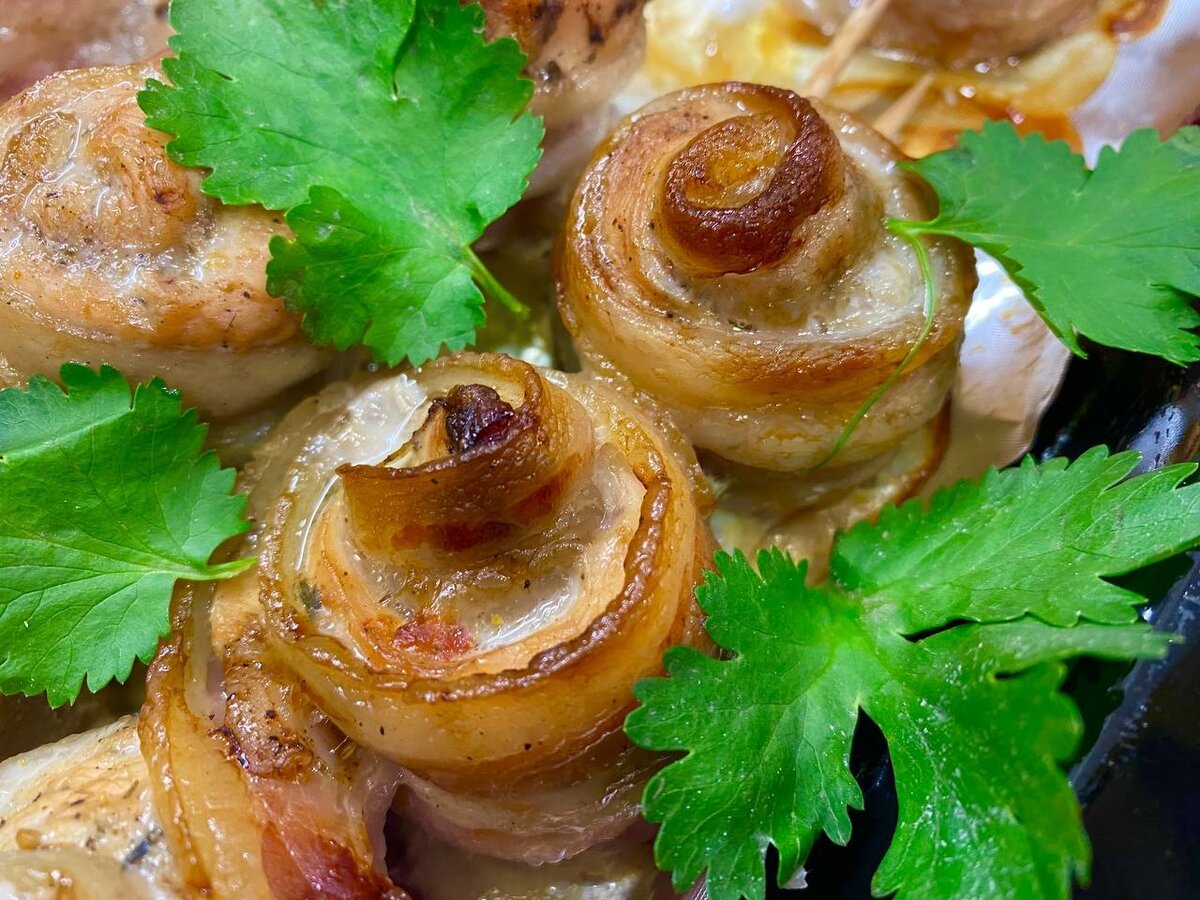 После этого каждый кусочек заворачивается в бекон и насаживается на шпажку. Прекрасно подойдёт запекание в духовке при температуре 200°C в течение 40 минут. Такой шашлык не только порадует глаз, но и удивит вкусом!