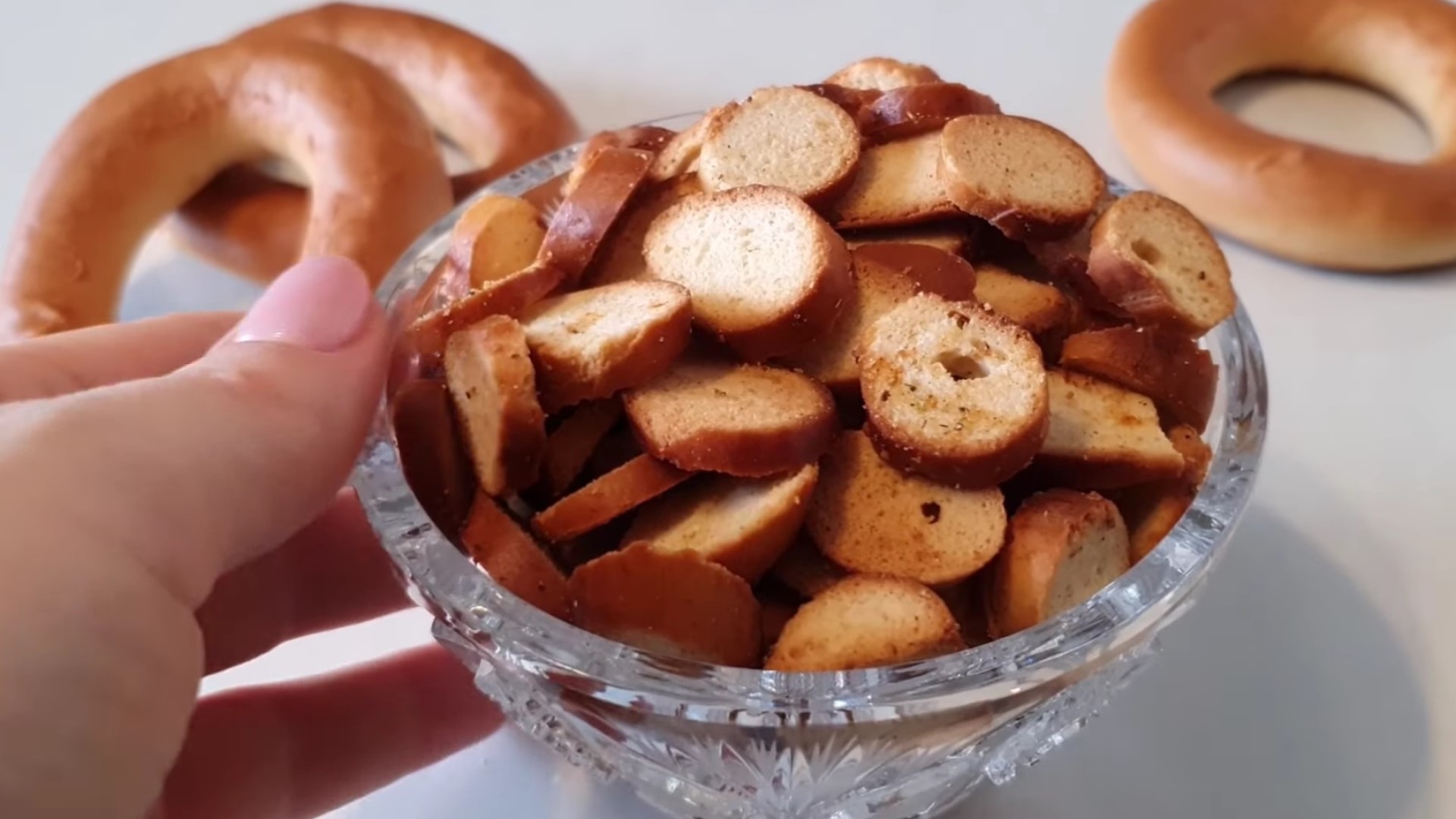 Секрет идеальной формы сухариков — использование бубликов. Вы можете взять свежую или черствую сдобу, разницы нет. Для начала нарежьте изделие на пластины. Они станут основой для снеков.