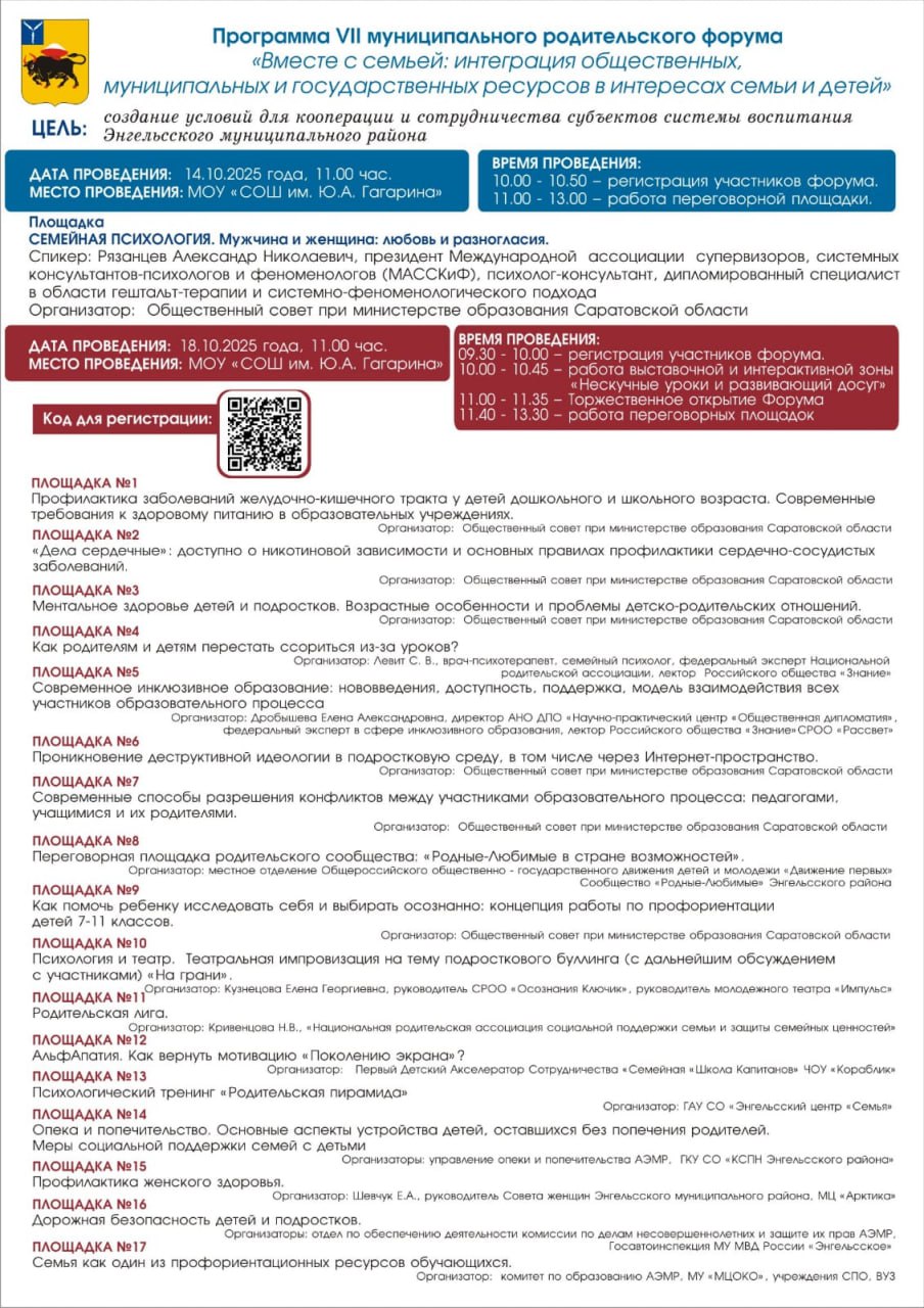 Еще одно мероприятие Форума состоится 18 октября на базе МОУ «СОШ им. Ю.А. Гагарина» с 9:30. Зарегистрироваться Вы можете, отсканировав QR-код на афише.