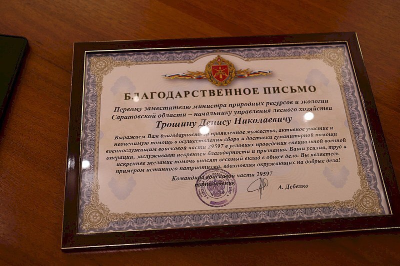 Большое спасибо за выделение на нужды фронта древесины для строительства блиндажей и заготовки дров, — сказал Александр Г.