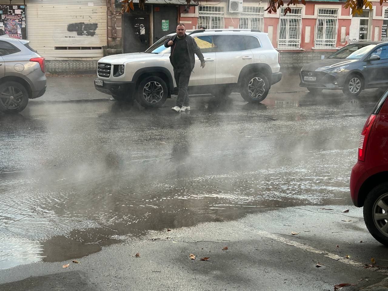 Коммунальную течь горожане заметили на пересечении улиц Железнодорожной и Вавилова. Вода спускается вниз до улицы Астраханской.