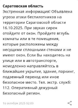 Экстренная информация РСЧС*: Объявлена угроза атаки беспилотников на территории Саратовской области 16.10.2025. При звуках сирен отойдите от окон. Пройдите вглубь комнаты или в те помещения, которые расположены между несущими сплошными стенами и не имеют окон, — сказано в уведомлении.