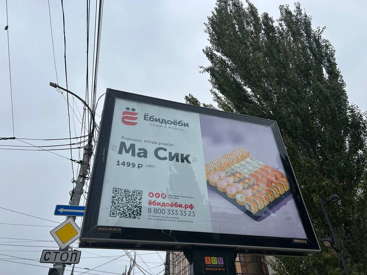 Это та самая доставка суши, из-за названия которой доходили до Арбитражного суда. Уже висит реклама с предложением заказать сет "Ма сик" (1,5 кг за 1499). Названия там самые нескучные: есть роллы "БиЧ" и "Куни Ли".