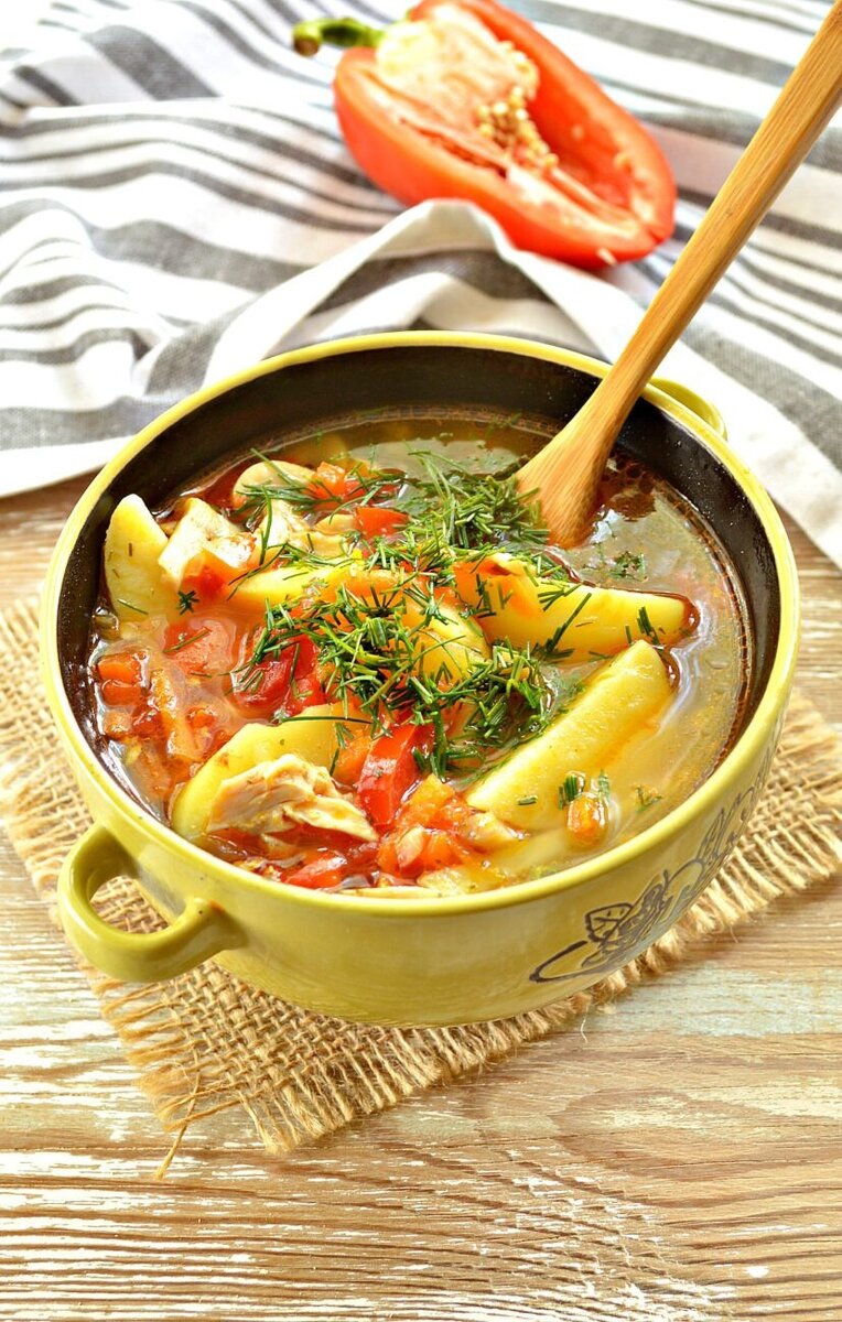 Продолжать варить суп до готовности картошки, приправив его любимыми специями и свежей зеленью.