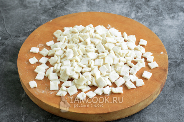 В это время раскатайте тесто в лепешку толщиной 2-3 мм, нарежьте её на квадраты и обваляйте в муке — это предотвратит слипание. После 30 минут варки, добавьте тесто в суп и держите на огне еще 5 минут.
