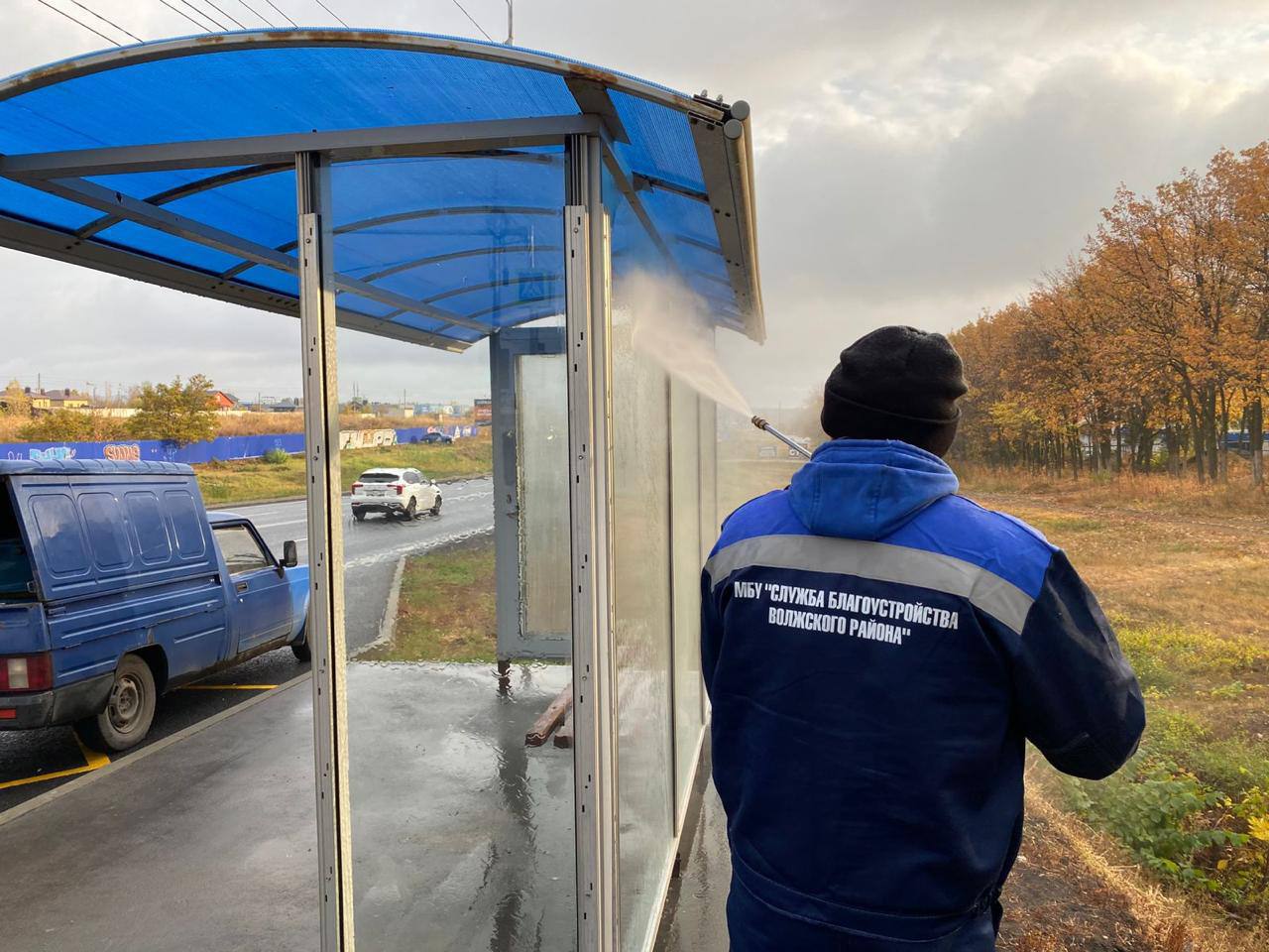 Коммунальные службы выполняют уборку дорожного полотна и пешеходных зон, мойку остановочных павильонов, подготовку цветников к зимнему периоду, обрезку кустарников и деревьев, сбор случайного мусора, опавшей листвы и другие работы