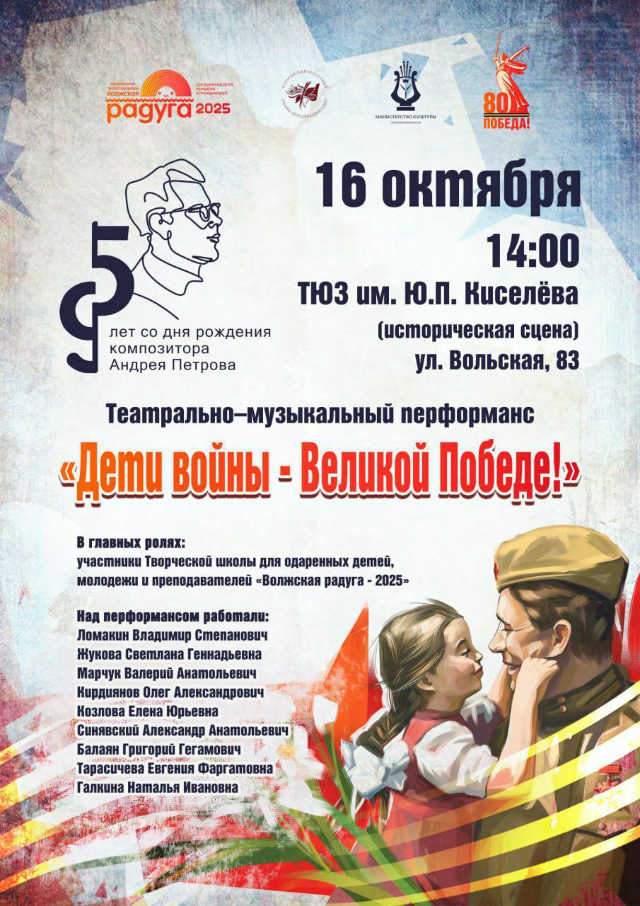 В этот же день в театре юного зрителя им. Ю.П. Киселёва состоялся музыкально-театральный перформанс «Дети войны – Великой Победе». Почётным гостем стала дочь композитора Ольга Андреевна Петрова.