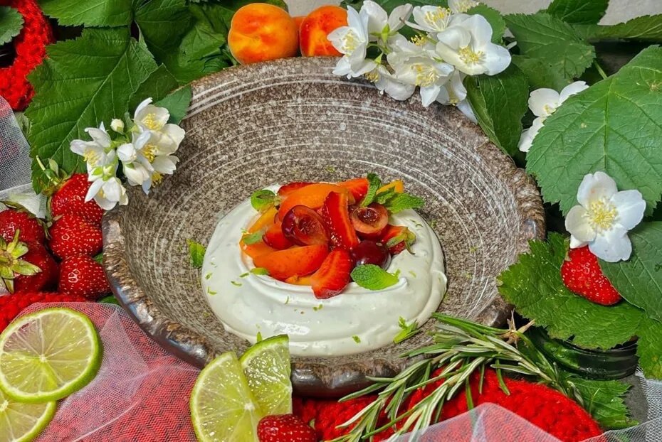 В глубокой чаше блендера объединить творог, сыр креметте, сгущенное молоко и сметану. Взбить до достижения однородной массы без комочков.Отдельно взбить сливки до мягких пик, а затем аккуратно добавить в творожную основу.Слегка натереть цедру лайма и вмешать в смесь для дополнительного аромата.Подготовить фрукты: клубнику нарезать, у абрикосов и черешни удалить косточки, а абрикосы нарезать дольками.На плоской тарелке аккуратно выложить творожную массу в виде облака, украсить свежими фруктами в центре.Декорировать??ми в мяте, добавить немного лаймовой цедры сверху для яркости и свежести.Подавать к столу, наслаждаясь неповторимым вкусом и ароматом летних ягод.Такой десерт станет изюминкой любого стола и украсит ваше меню яркими акцентами!