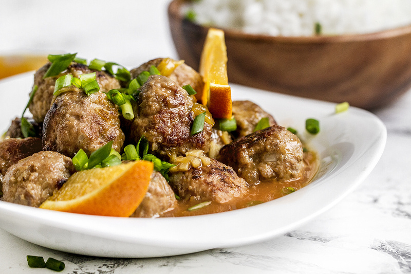 Шаг 4: Для соуса натереть очищенный имбирь на мелкой терке. В миске выжать сок апельсина, добавить соевый соус, мед, тертый имбирь, крахмал и 50 мл холодной воды. Тщательно перемешать до однородности и влить в сковороду с фрикадельками. Готовить под крышкой еще 3-4 минуты на среднем огне. Подавайте блюдо немедленно, наслаждаясь его сочным вкусом!