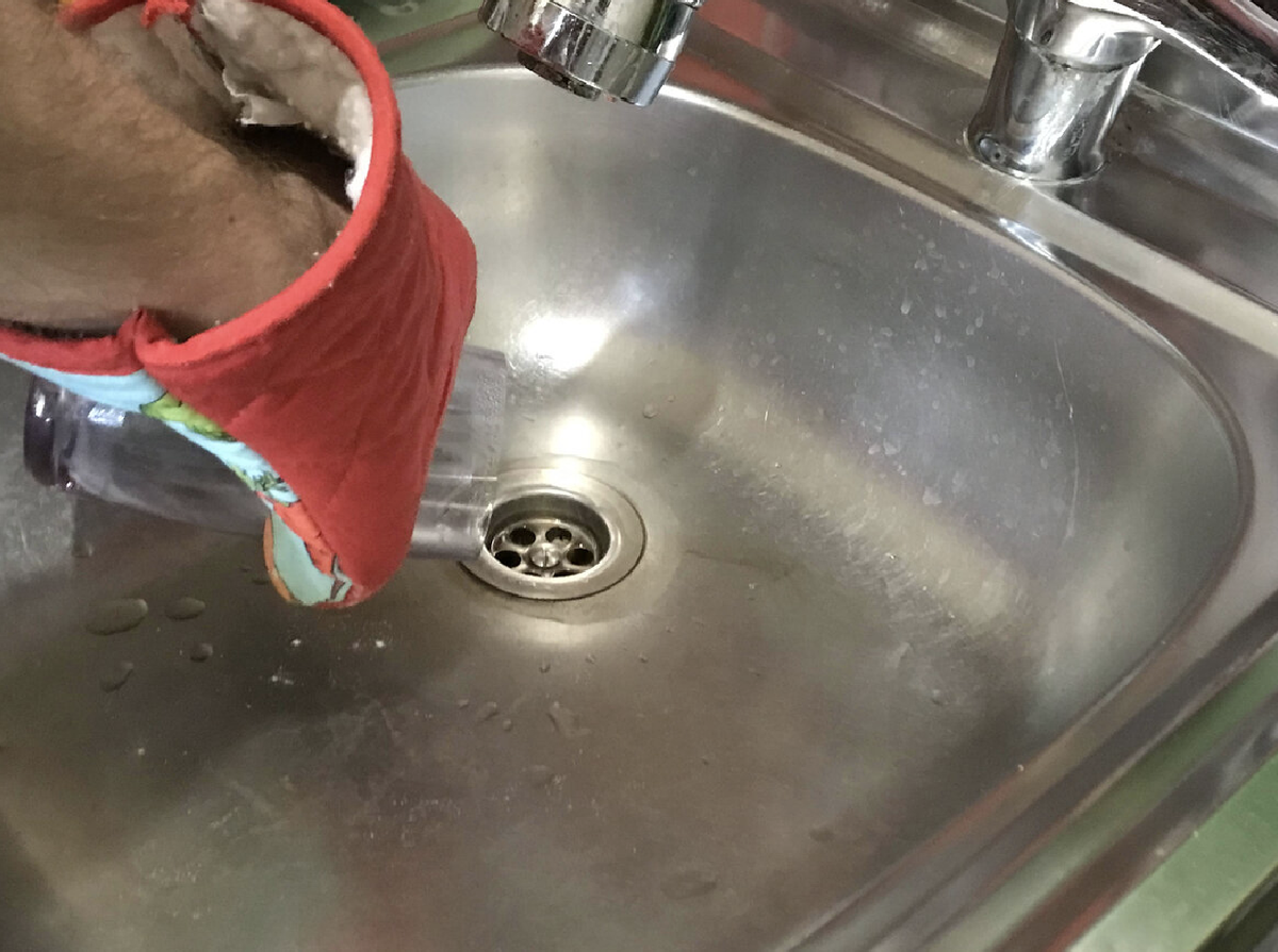 - Через полчаса промыть трубы горячей водой или использовать чайник с кипятком.