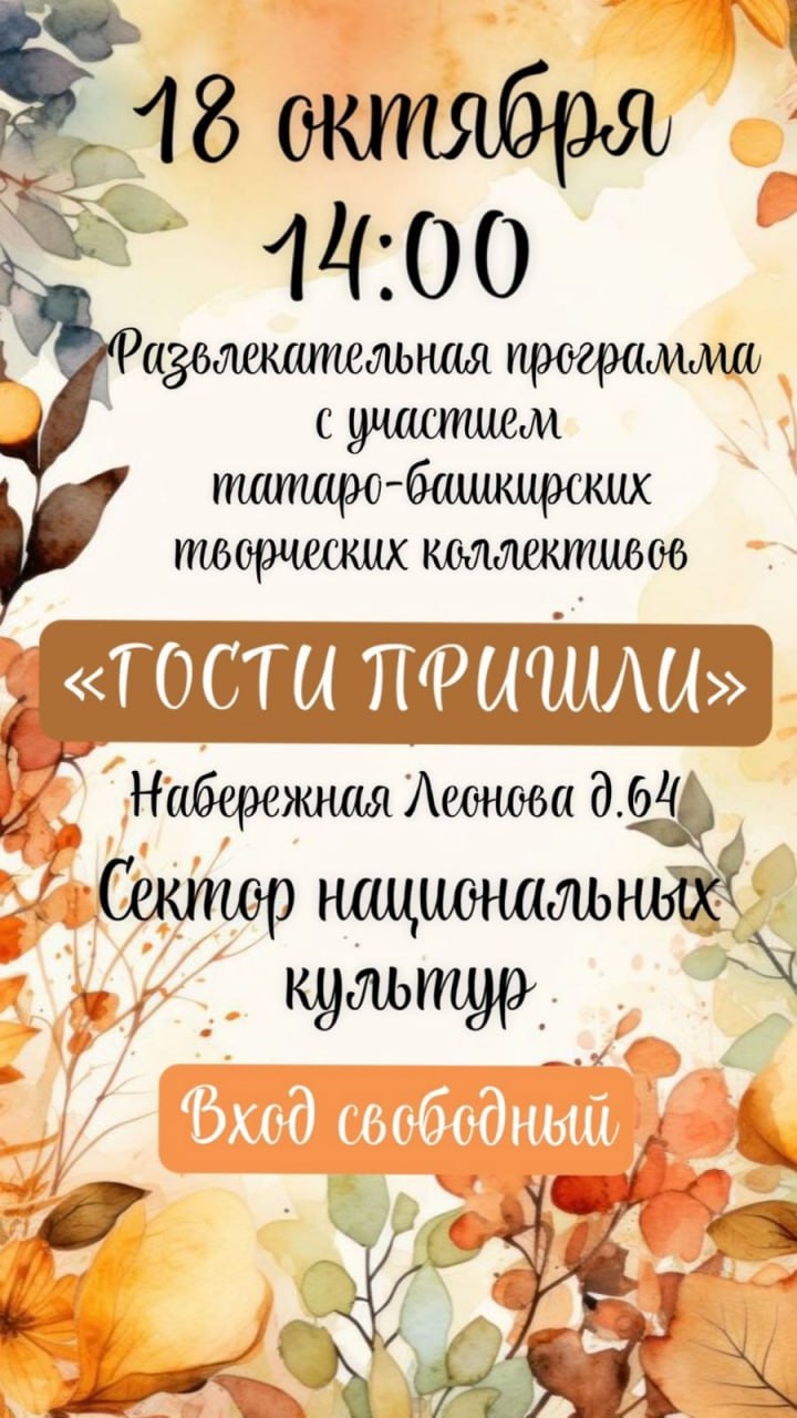 В секторе национальных культур на Набережной Леонова, 64 состоится концертная программа "Гости пришли". В ней примут участие татаро-башкирские творческие коллективы.