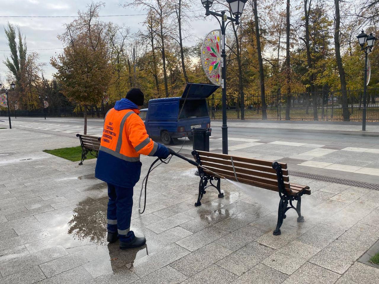 Коммунальные службы выполняют уборку дорожного полотна и пешеходных зон, мойку остановочных павильонов, подготовку цветников к зимнему периоду, обрезку кустарников и деревьев, сбор случайного мусора, опавшей листвы и другие работы