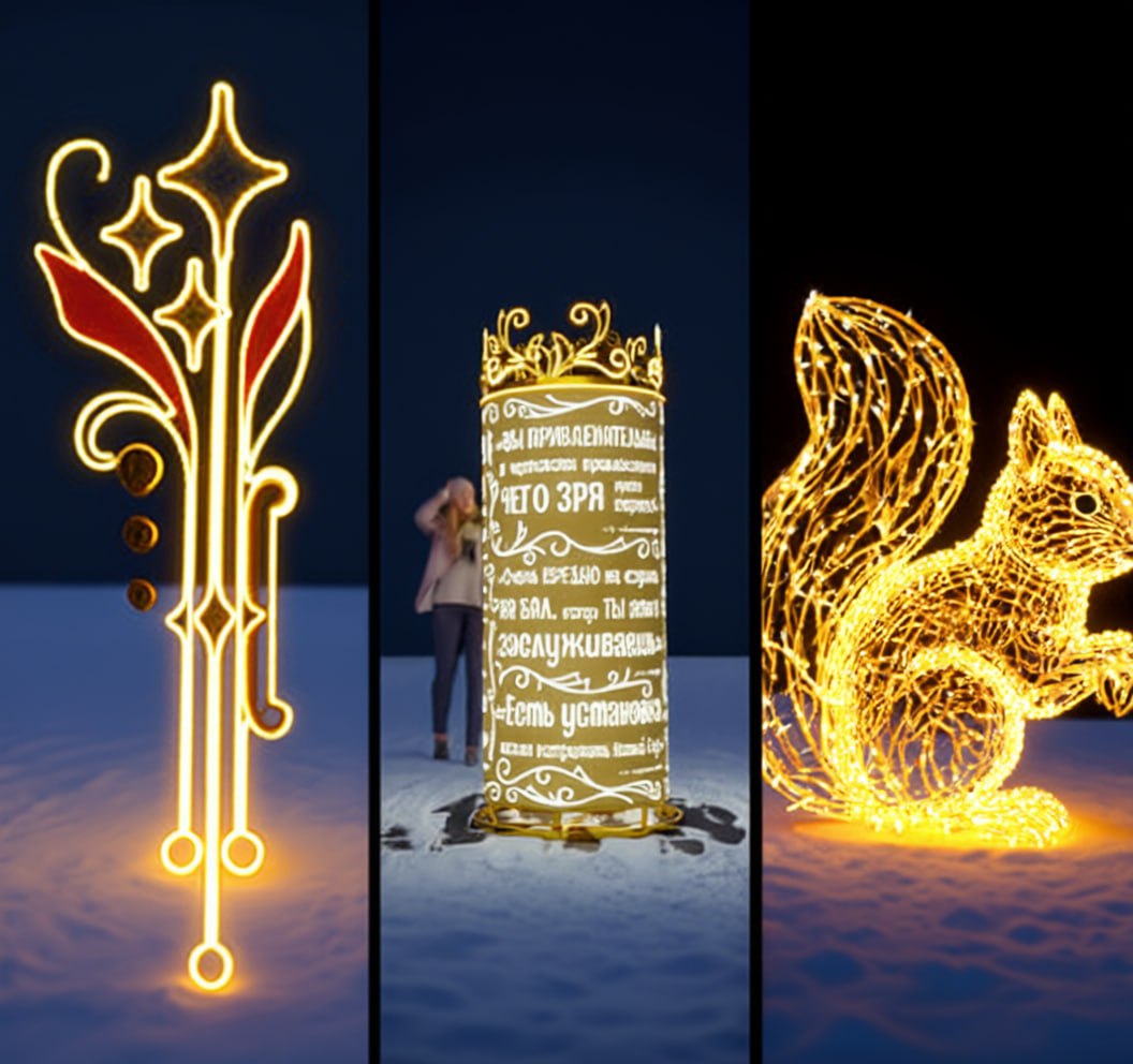 Новые световые инсталляции ( "золотая брошь", афиши пожеланий, "белочка с орехом") установят на улице Радищева и на участке от Театральной площади до проспекта Столыпина. Также их смонтируют на Волжской улице и площади Кирова.