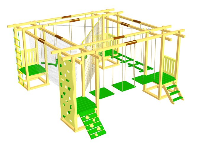 Конструкция парка включает 4 игровых площадки, 5 разнообразных препятствий и многое другое. Парк рассчитан на детей ростом до 140 см и весом не более 70 килограммов.