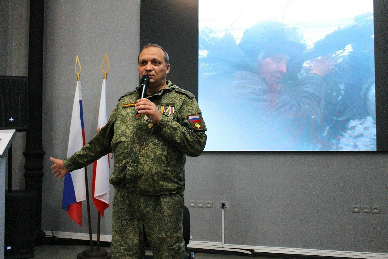 В Музее СВО прошла встреча с участником спецоперации, командиром взвода штурмовой роты Олегом Мысовым. Он участвовал в СВО с ноября 2022 года по май 2023 года в качестве добровольца. Имеет боевые награды.