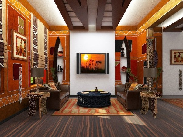 Африканский стиль является одним из самых выразительных подвидов этнического направления. Здесь в обиход берутся только натуральные материалы: бамбук, кожи экзотических животных и шерсть. Цветовая гамма должна варьироваться от желто-коричневых тонов до глубокого черного. Неповторимый облик смогут придать такие детали, как статуэтки, вазы и коврики из бамбука, создавая собственный маленький уголок Африки.