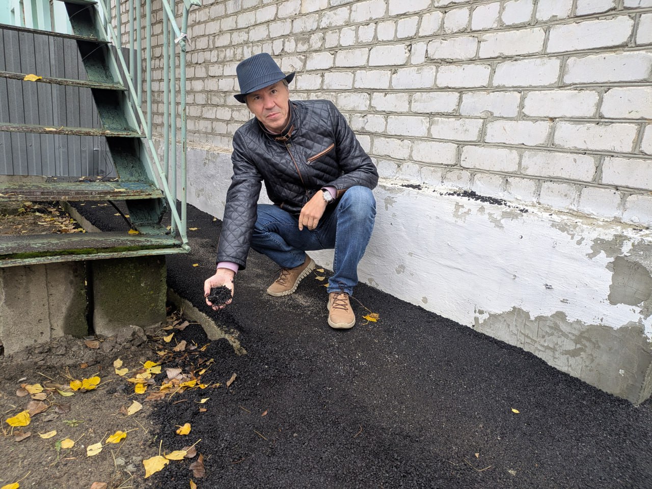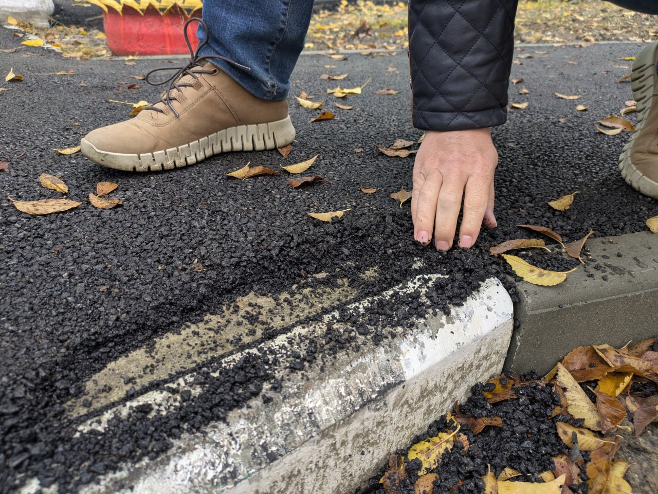Но это не главная проблема. На отмостку и дорожки в детсаде №50 положен такой асфальт, что его верхний слой я снимал рукой, он отслаивается и рассыпается. Это является грубейшим нарушением технологии. Это может быть из-за того, что укладывали остывший асфальт, а может быть плохой состав самого асфальта. Это даже не просто выкрашивание, это безобразная работа. При том, что в соседнем, бывшем детсаде №8, таких проблем не возникло. Здесь экспертизу должна провести организация стройконтроля. В любом случае эти бракованные участки нужно перекладывать.