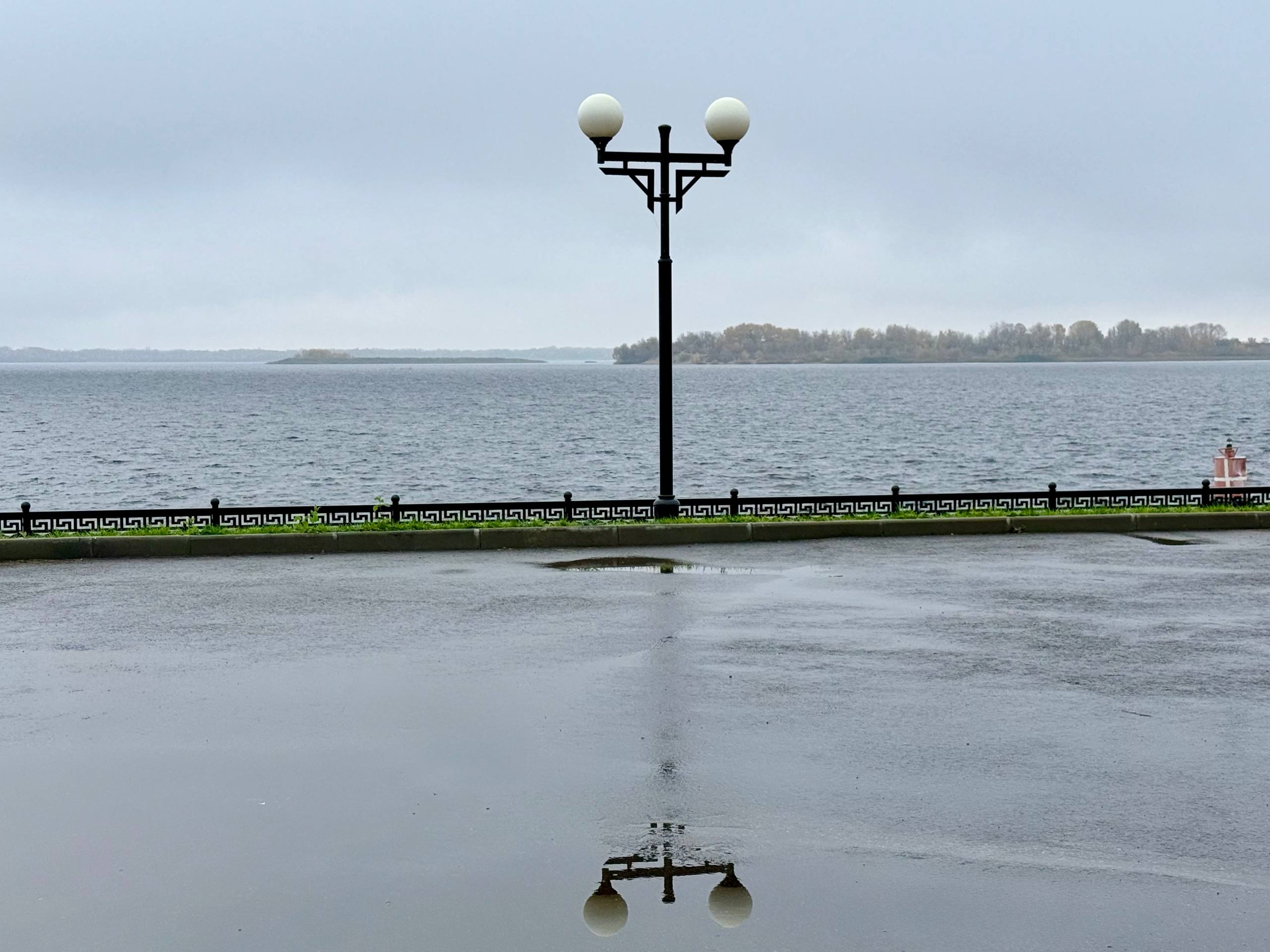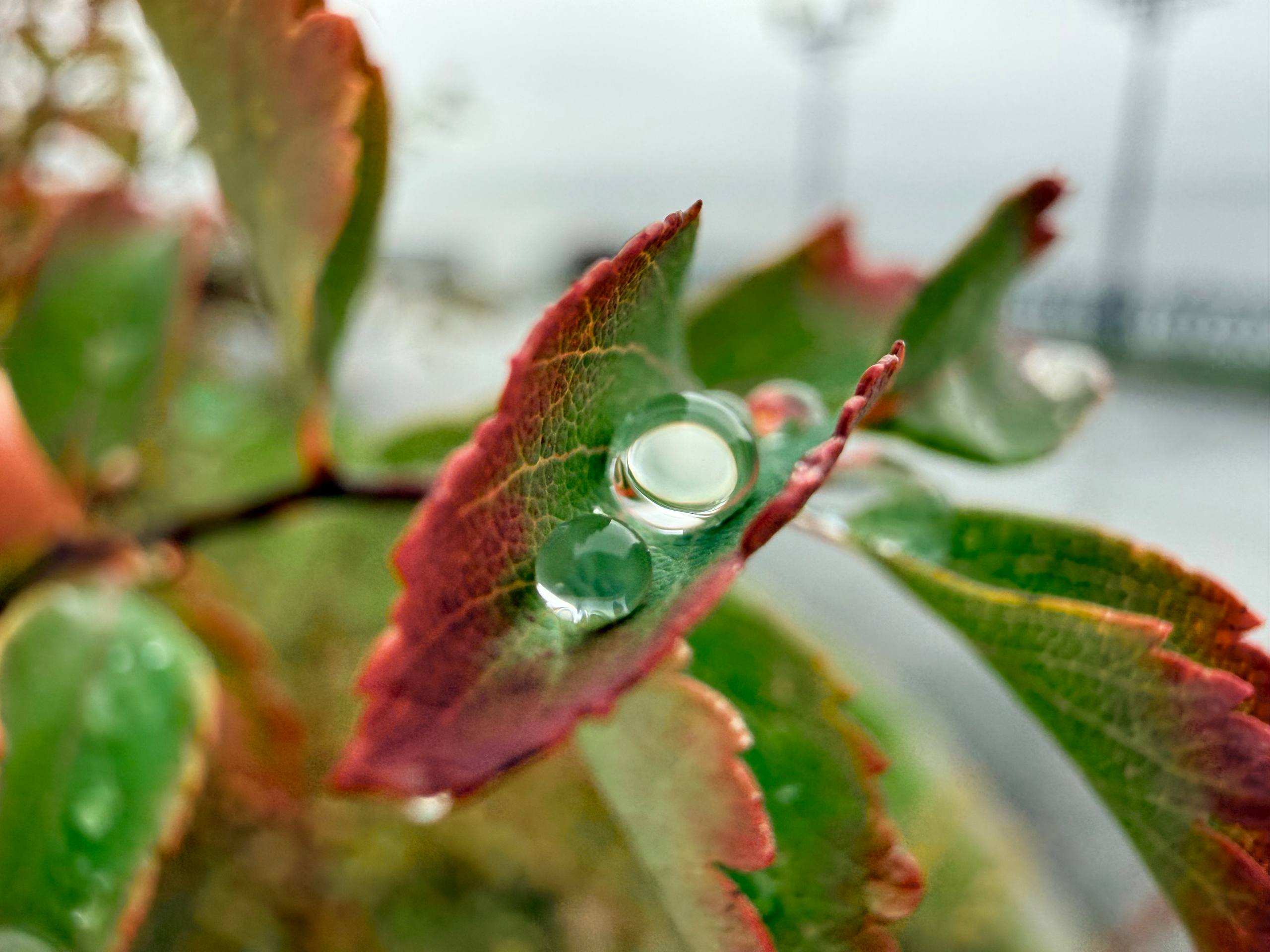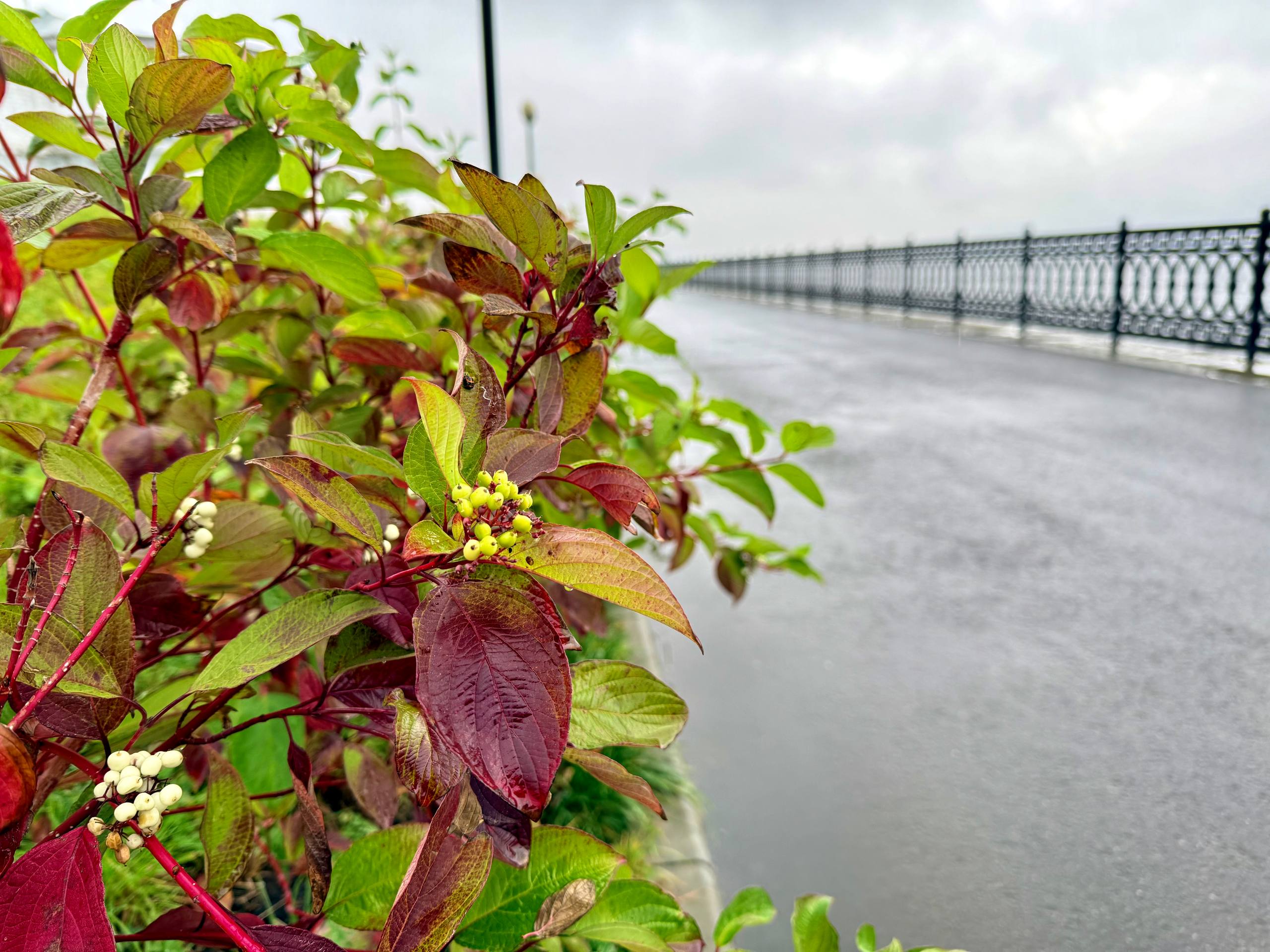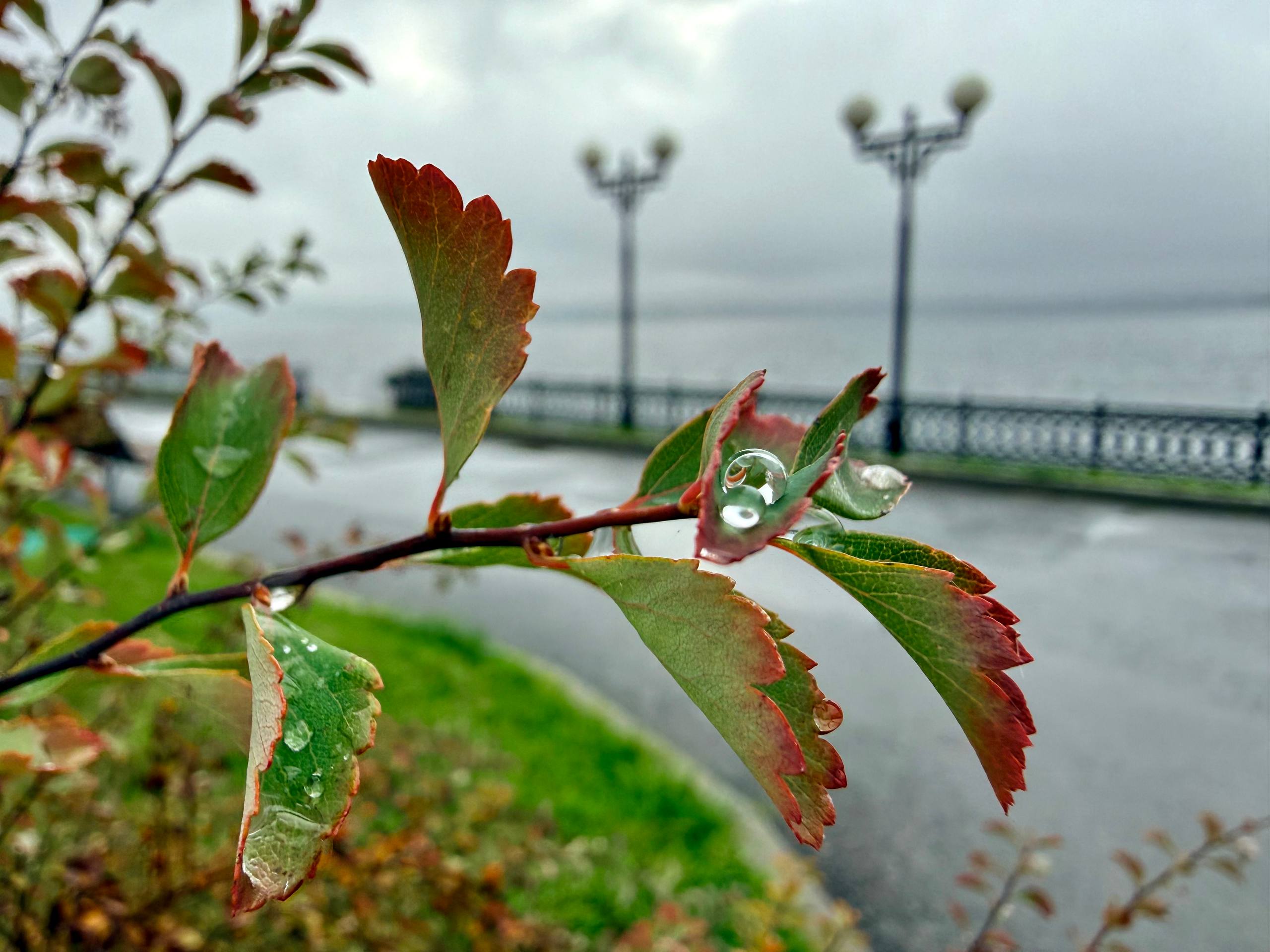 Мягкая серая палитра неба и легкая дымка тумана создают атмосферу таинственности и покоя. Капли вчерашнего дождя, словно драгоценные камни, сверкают на листьях, добавляя утренней картине особую прелесть.