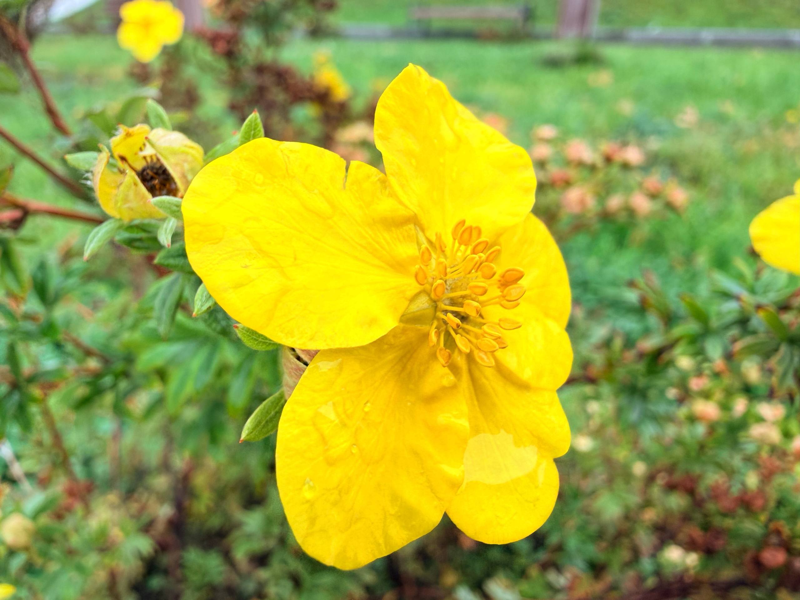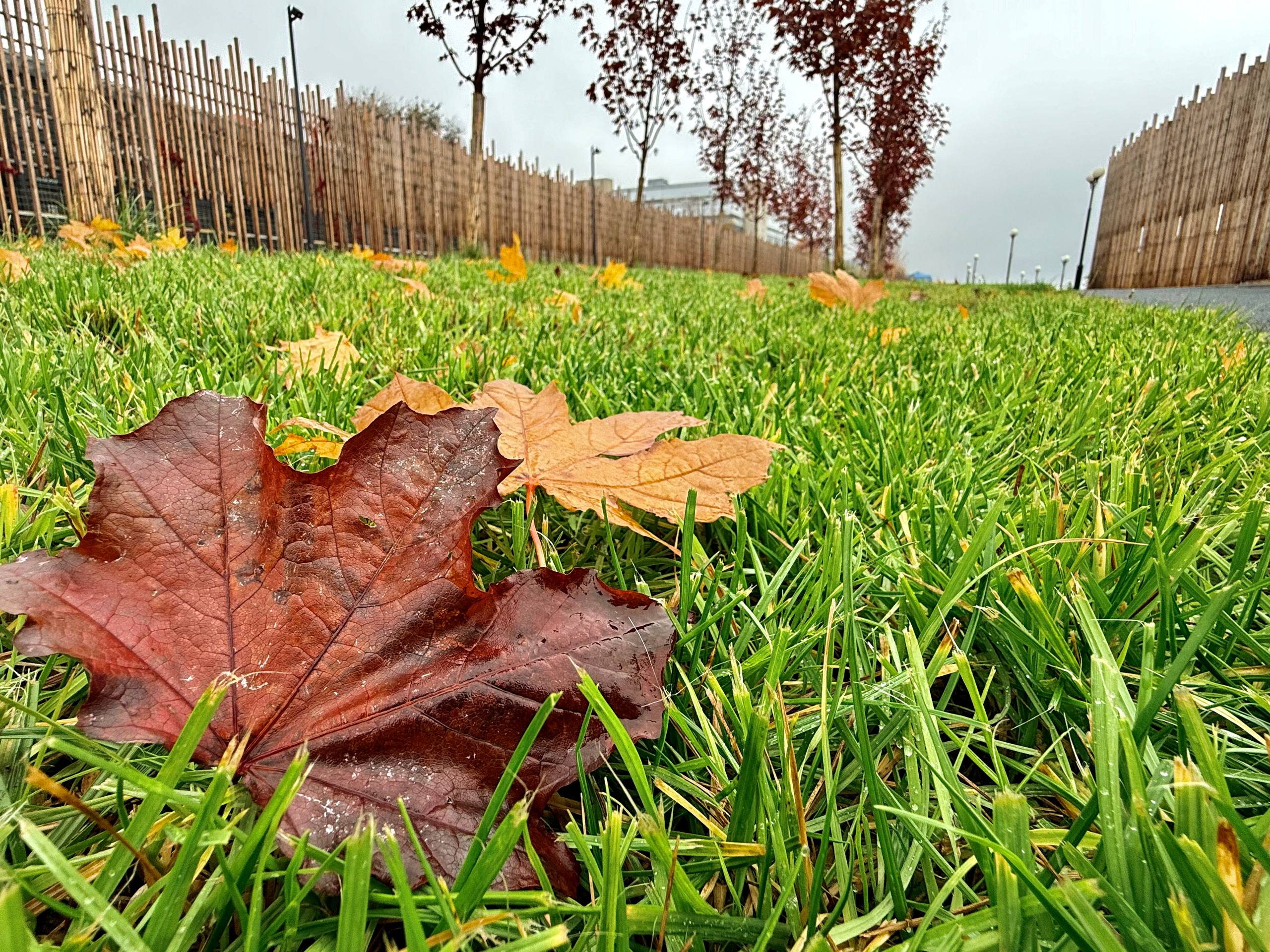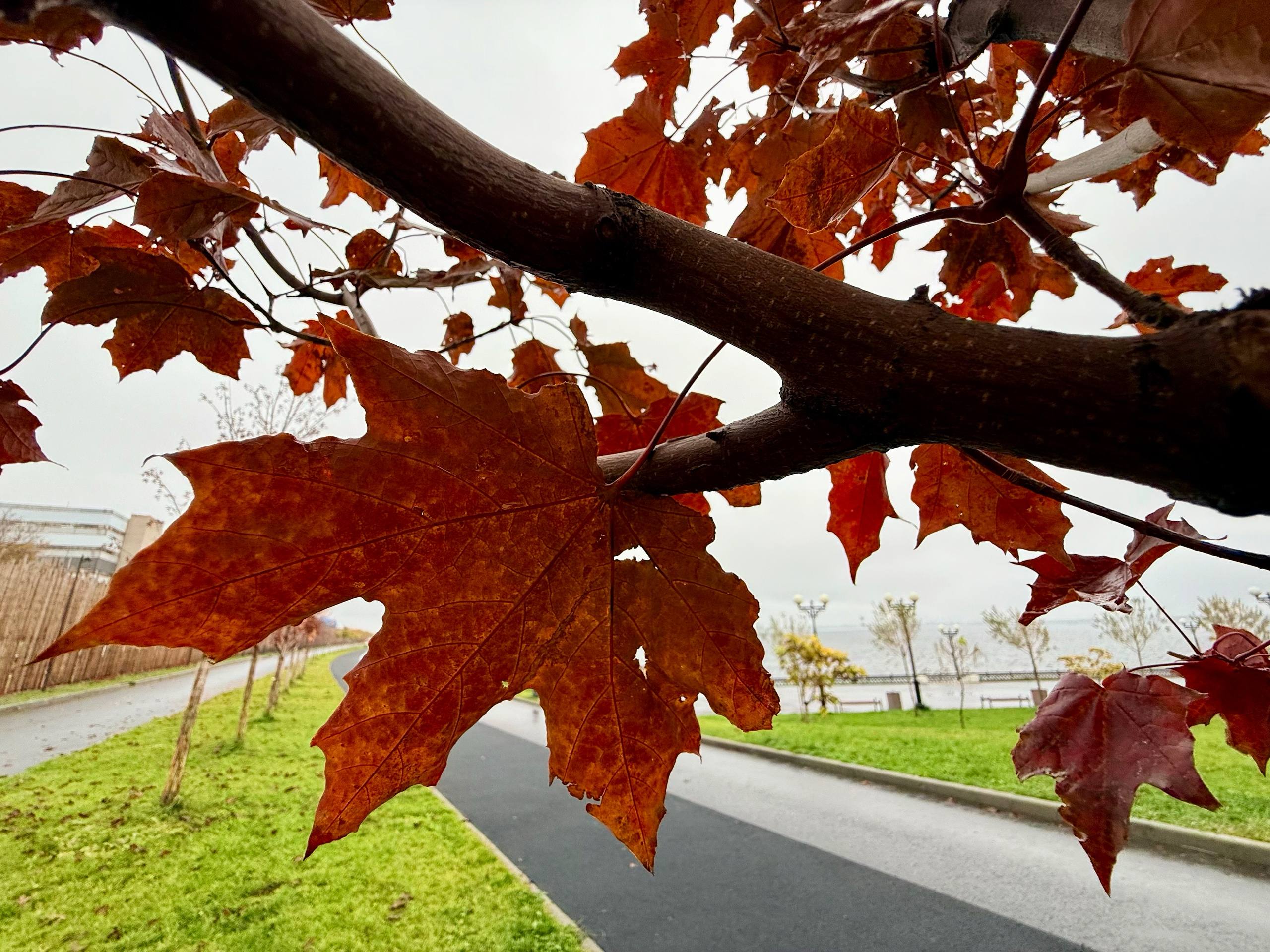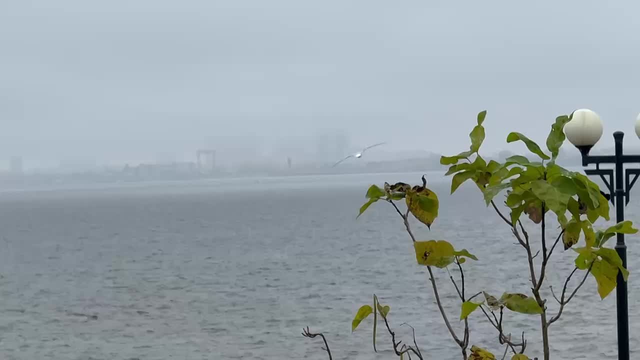 Мягкая серая палитра неба и легкая дымка тумана создают атмосферу таинственности и покоя. Капли вчерашнего дождя, словно драгоценные камни, сверкают на листьях, добавляя утренней картине особую прелесть.