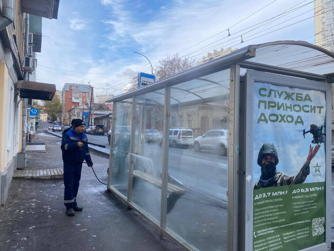 Коммунальные службы выполняют уборку дорожного полотна и пешеходных зон, мойку остановочных павильонов, подготовку цветников к зимнему периоду, обрезку кустарников и деревьев, сбор случайного мусора, опавшей листвы и другие работы