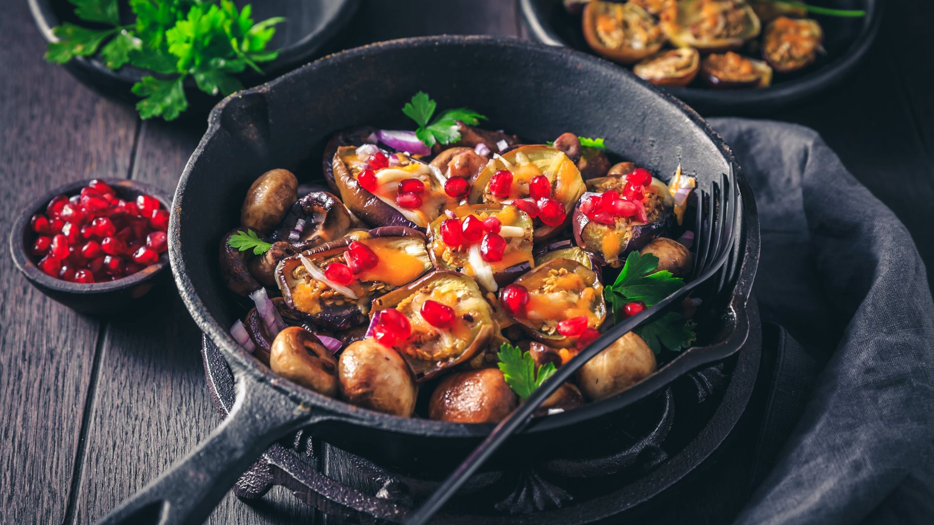 Нарежьте баклажан на небольшие куски, сложите в миску и присыпьте солью. Лук и чеснок тоже порубите мелко, затем обжарьте на оливковом масле. Приправьте эти два овоща паприкой, перцем и кумином.