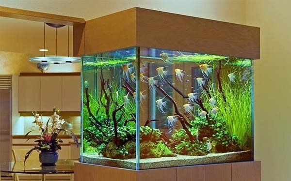 - Аквариум не только украшает интерьер, но и способствует увлажнению воздуха в помещении.