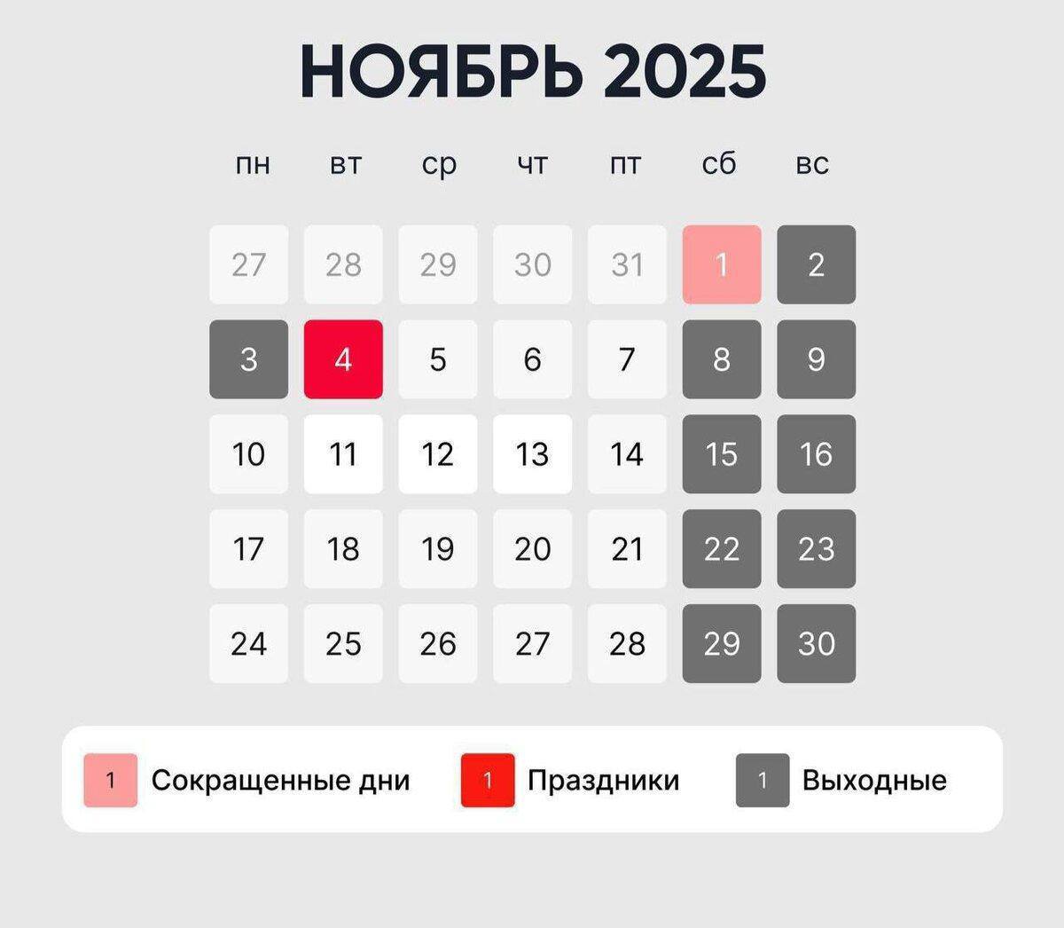 Она продлится с 27 октября по 1 ноября. Предусмотрен перенос выходного дня с субботы 1 ноября на понедельник 3 ноября. Суббота будет сокращенной, как и положено. Потом отдыхаем целых три дня - со 2 по 4 ноября.