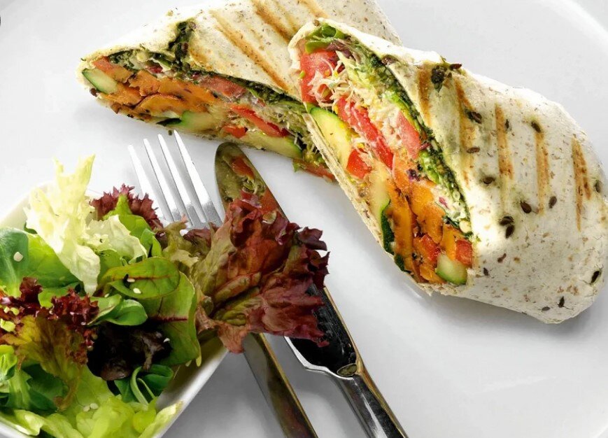 Сначала обжарьте на гриле сладкий перец, нарезанный на кольца, цукини (толщиной около 1,5 см) и батат, предварительно нарезанный дольками не толще 1 см. Обжаривайте овощи до готовности с обеих сторон, затем нарежьте их крупной соломкой.Нарежьте огурцы и помидоры кубиками среднего размера, а красный лук — мелко. Это добавит свежести и яркости в блюдо.Разогрейте тортильи на сковороде, чтобы они стали мягкими и эластичными. Затем намажьте их песто и выложите часть салатных листьев, помидоры, огурцы, лук и жареные овощи. Добавьте майонез и ростки люцерны по вкусу.После этого сложите края тортильи и аккуратно скрутите буррито. Обжарьте его с обеих сторон на гриле до золотистой корочки.Подавайте буррито с дополнительными салатными листьями, посыпанными кунжутом, и добавьте несколько капель оливкового масла extra virgin для завершения блюда.