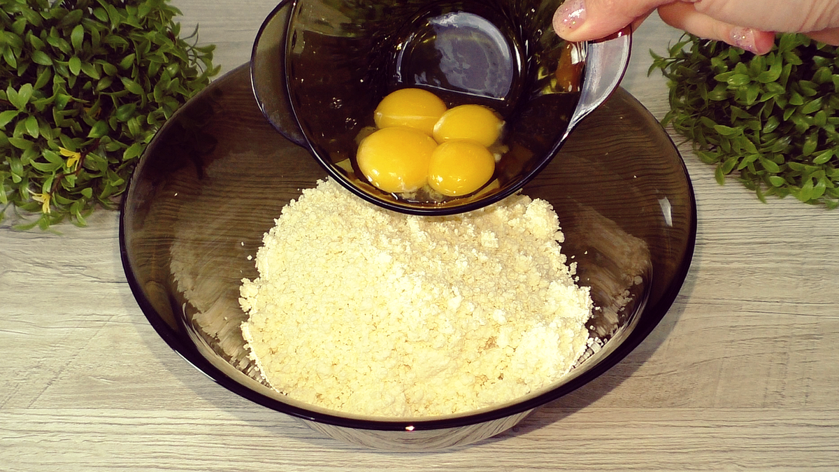 Приготовление начинается с подготовки ингредиентов. В глубокую миску помещается творог, куда добавляются желтки яиц. Белки необходимо отложить в сторону, они взобьются отдельно до пышной массы.