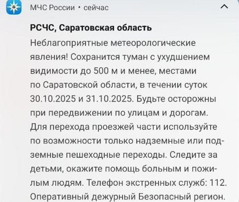 Экстренная информация РСЧС*: Сохранится туман с ухудшением видимости до 500 м и менее, местами по Саратовской области, в течении суток 30.10.2025 и 31.10.2025, — сказано в уведомлении.