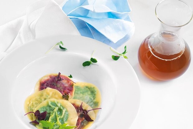 Далее, несильно обжарить мелко нарезанные луковицы на растительном масле до золотистого цвета. Ботву редиса, свеклы и зелень сельдерея нарезать крупными кусочками. Каждый вид зелени следует смешать с равным количеством жареного лука. Далее, равиоли формируются с различной начинкой, что придает блюдам особую уникальность.