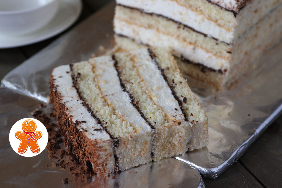 После выпечки дайте бисквиту немного остыть, затем нарежьте его на три коржа. Края, которые обычно высыхают, можно подсушить и растереть — они пригодятся для оформления торта.