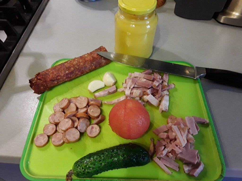 - Свежий помидор, огурец, луковица и пару зубчиков чеснока