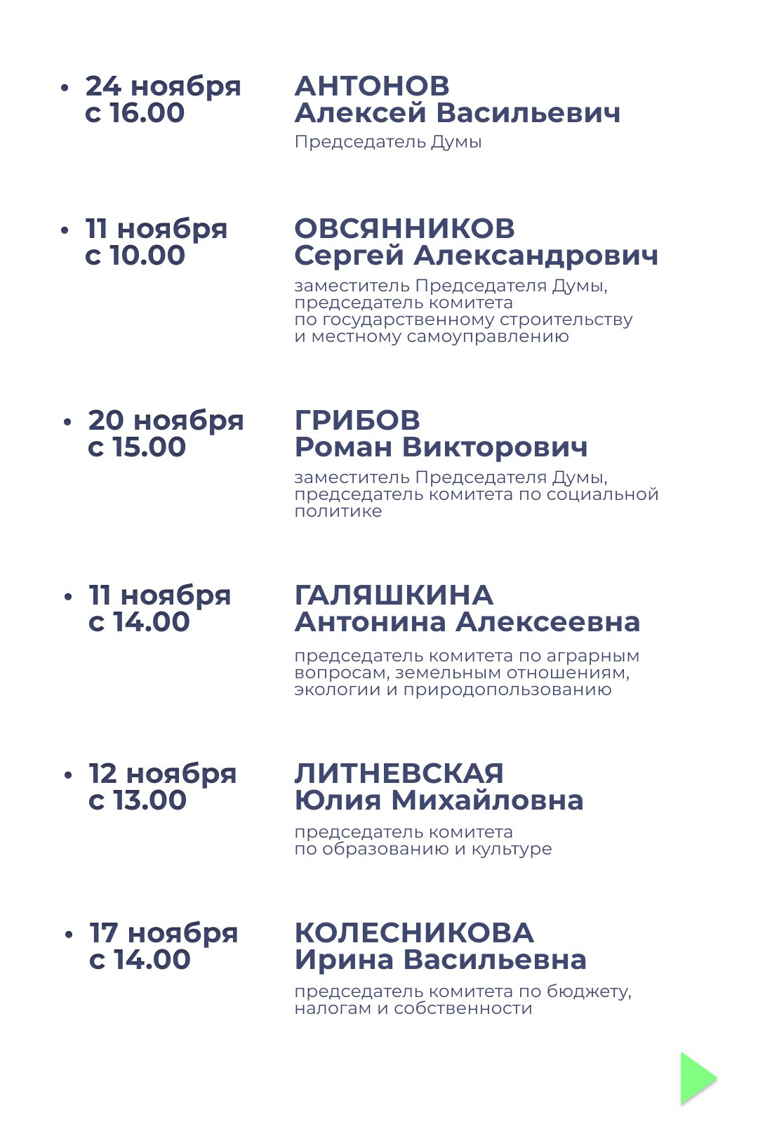 Публикуем график личных приемов граждан в ноябре 2025 года по вопросам законодательной деятельности Саратовской областной Думы.