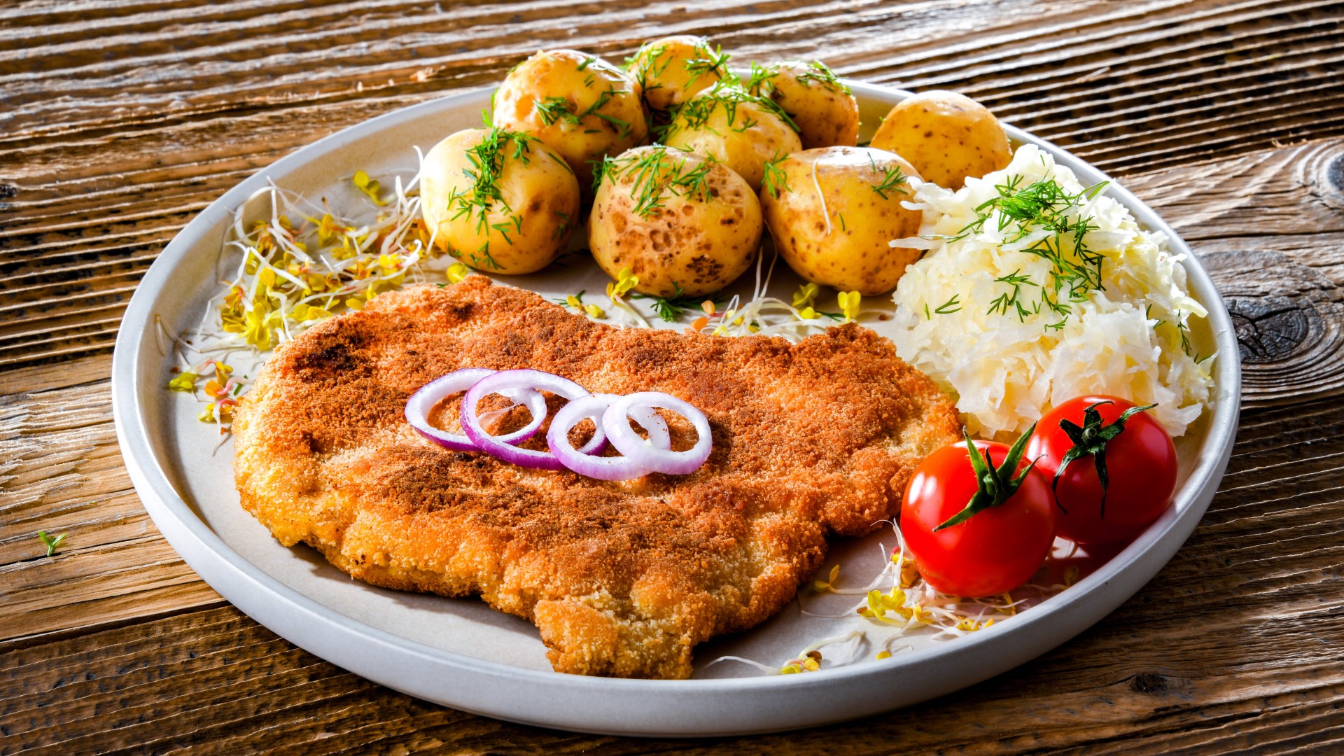 Для начала нужно обвалять мясо в муке и окунуть в белый соус. Он готовится из яйца и масла. Затем запанируйте заготовку в сухарях и слегка прижмите крошки. Потом еще раз опустите ее в соус и снова — в сухари.