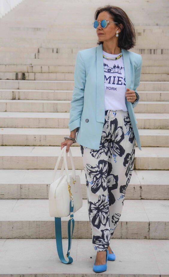 - Стильный аутфит создается с легкими светлыми брюками с цветочным принтом, белой футболкой и нежно-голубым жакетом. Образ дополнит голубая обувь на невысоком каблуке и стильные аксессуары, такие как темные очки и белоснежная сумка.