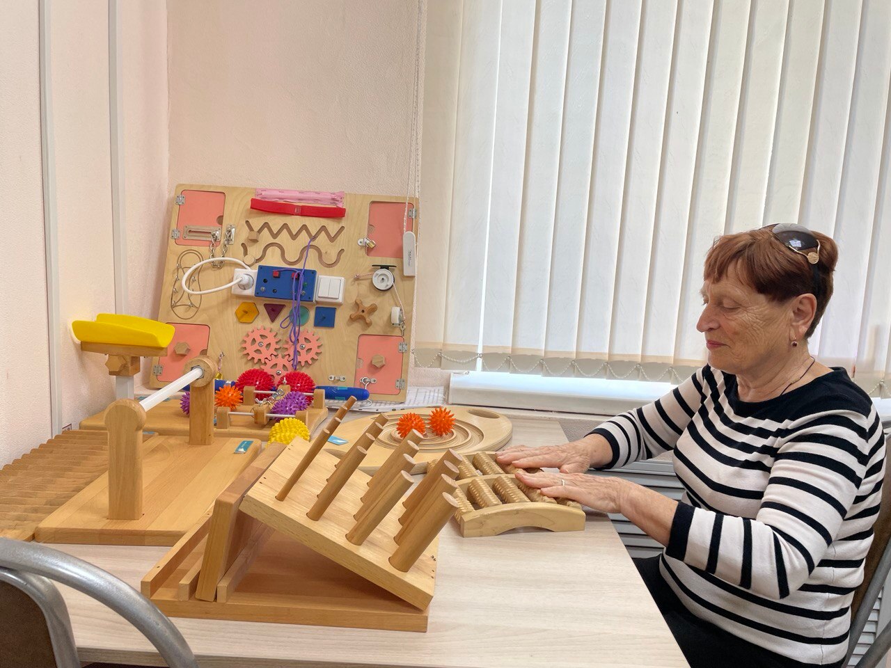 С помощью специального оборудования получатели услуг выполняют упражнения «пальчиковой гимнастики», работают с балансирами и бизибордами. Все это помогает им быстрее восстановиться и обрести уверенность в своих силах.
