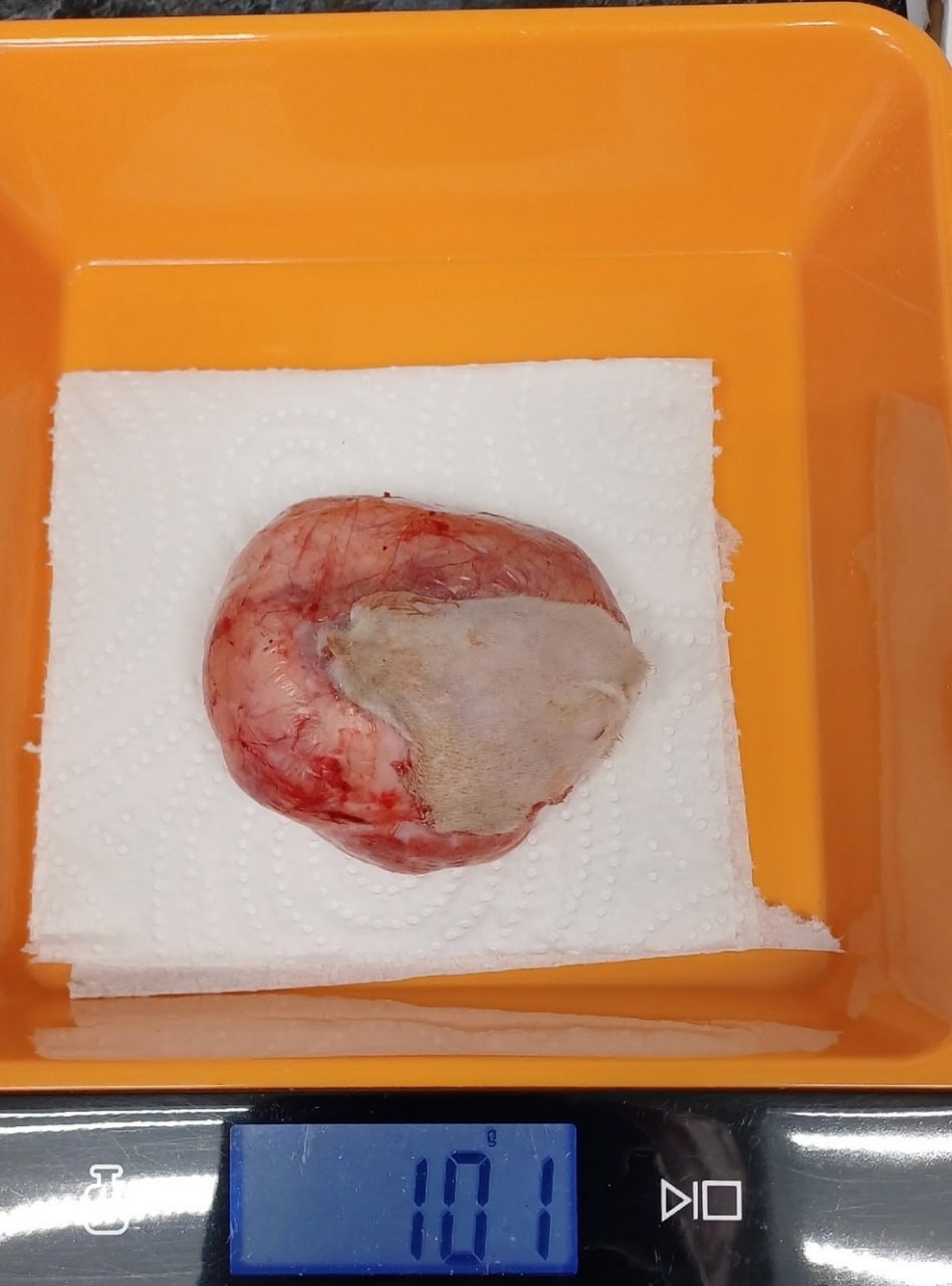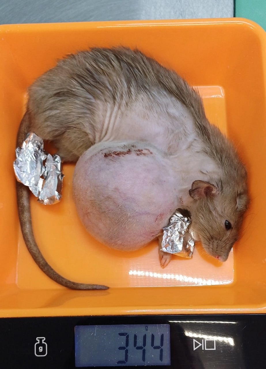 Отметим, что вес крысы составил 344 граммов, а удаленная опухоль — 101 грамм. Это почти 1/3 от общей массы животного.