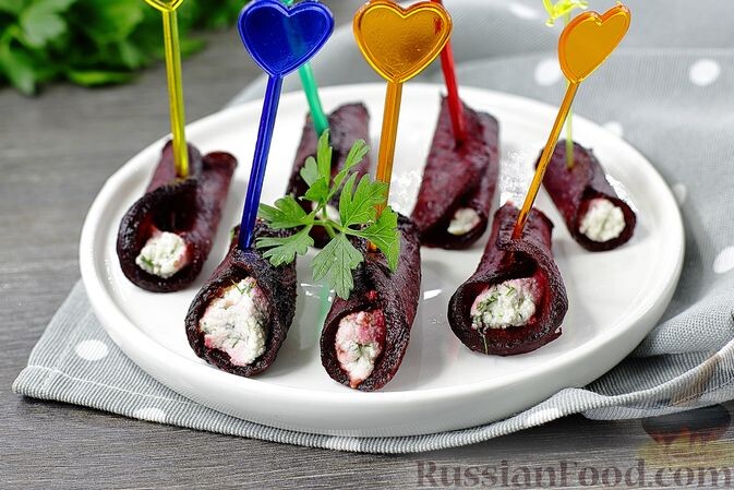 - Свекольные рулетики с творожной начинкой: Эта закуска станет настоящим хитом на любом столе. Обжаренные кружочки свеклы оборачивают нежный творог с зеленью и специями. Это простое, но эффектное блюдо обязательно привлечет внимание гостей.