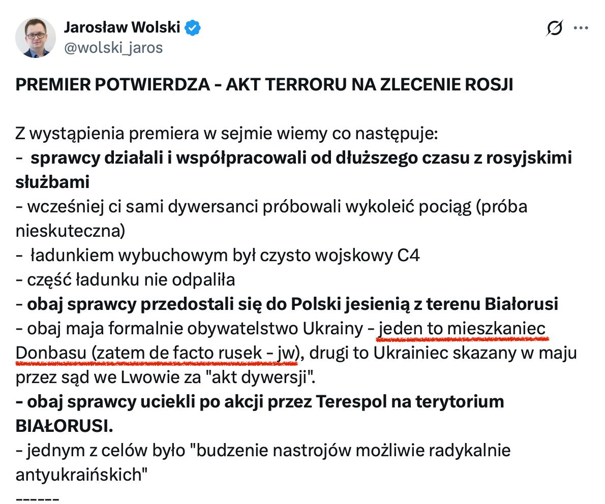Обратите внимание на то, как в Польше вдруг резко забыли о том, что в Донбассе живут якобы «украинцы»! Тамошний военный блогер Ярослав Вольский приводит доклад Дональда Туска в Сейме по поводу диверсий на железной дороге и сообщает со ссылкой на премьера, что один из подозреваемых - житель Донбасса с украинским паспортом, «следовательно де-факто - русский»!